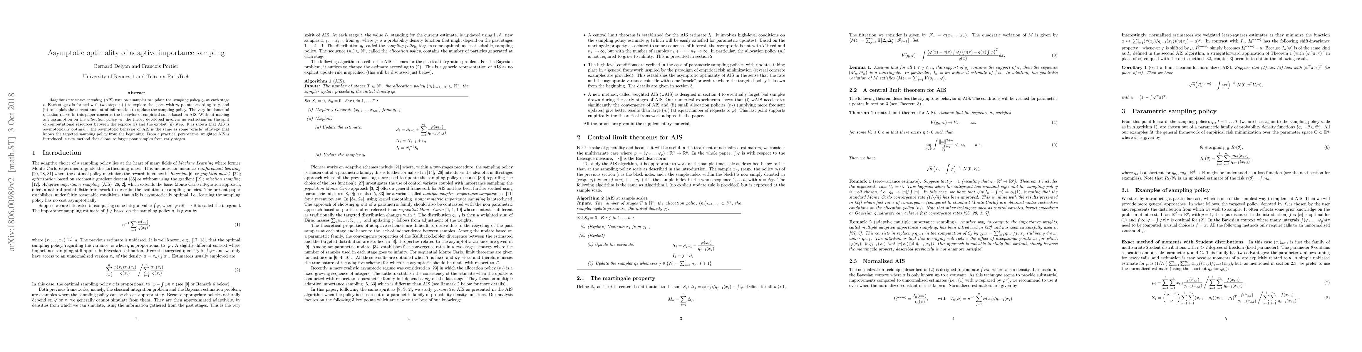 Adaptive importance sampling (AIS) is asymptotically optimal, meaning its performance approaches that of an ideal strategy that knows the targeted sampling policy from the beginning. AIS also allows for forgetting poor samples through a new method called weighted AIS.