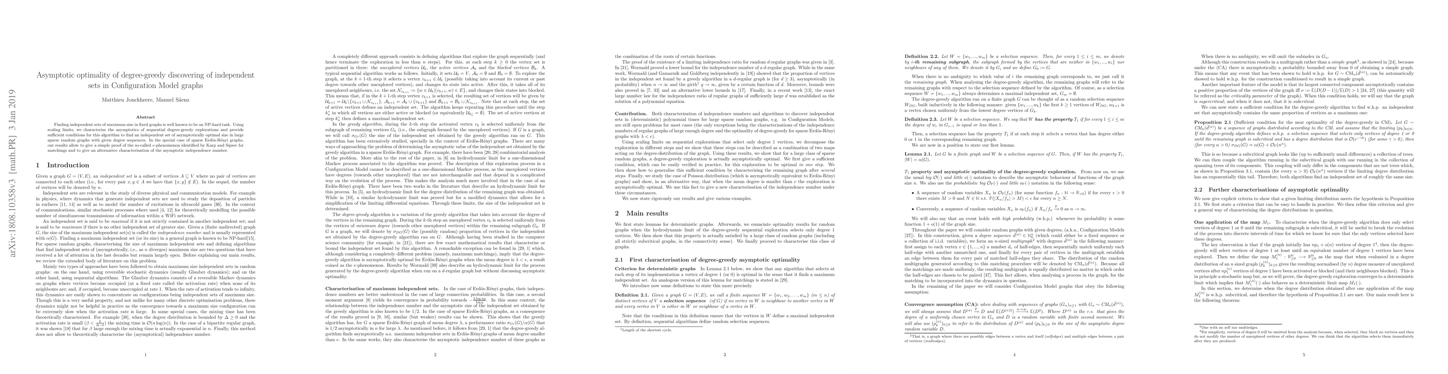 Finding independent sets of maximum size in fixed graphs is well known to be an NP-hard task. Using scaling limits, we characterise the asymptotics of sequential degree-greedy explorations and provide sufficient conditions for this algorithm to find an independent set of asymptotically optimal size in large sparse random graphs with given degree sequences. In the special case of sparse Erd\"os-R\'enyi graphs, our results allow to give a simple proof of the so-called $e$-phenomenon identified by Karp and Sipser for matchings and to give an alternative characterisation of the asymptotic independence number.