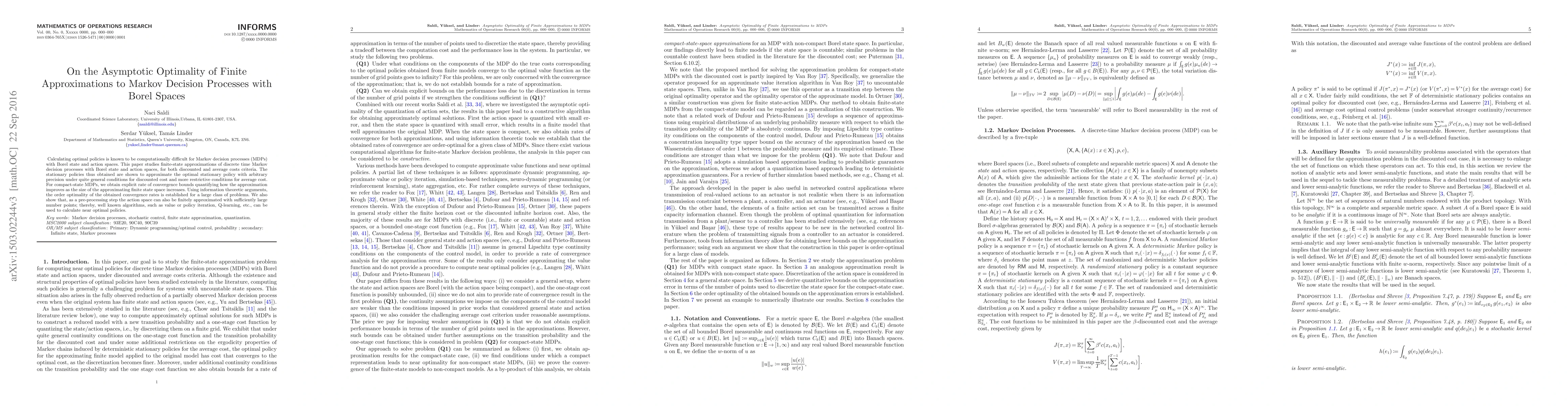 This paper investigates finite-state approximations for Markov decision processes with Borel state and action spaces, demonstrating that these approximations can converge to optimal policies with arbitrary precision under general conditions. It establishes explicit convergence rate bounds for compact-state MDPs and proves the asymptotic optimality of these rates using information theory.