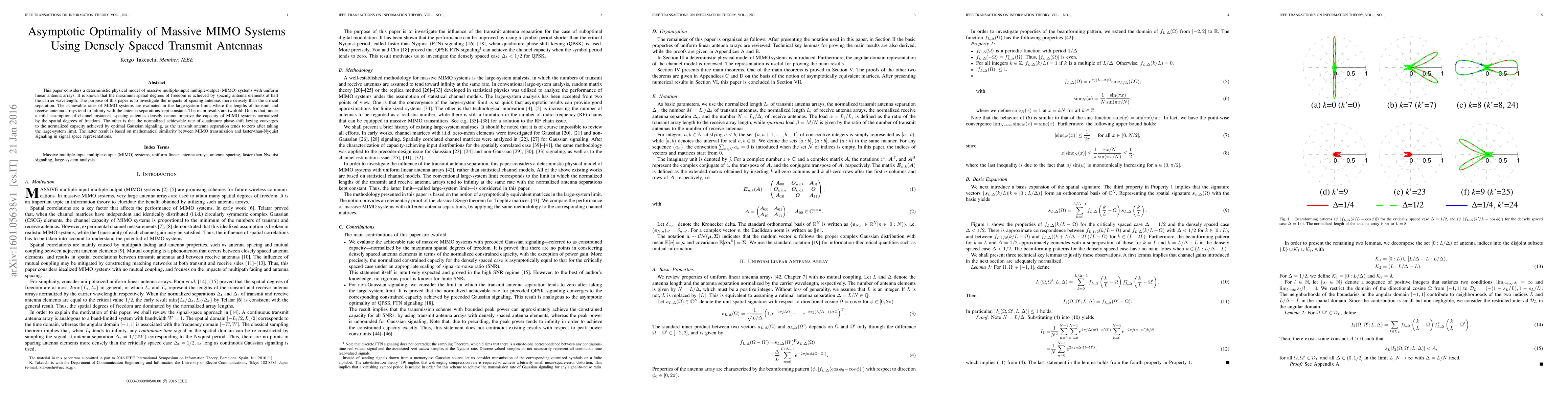This paper explores the performance of massive MIMO systems with densely spaced transmit antennas, finding that while dense spacing does not improve normalized capacity, it asymptotically converges to the optimal Gaussian signaling rate in large-system limits. The study uses a deterministic physical model and evaluates achievable rates under uniform linear antenna arrays.