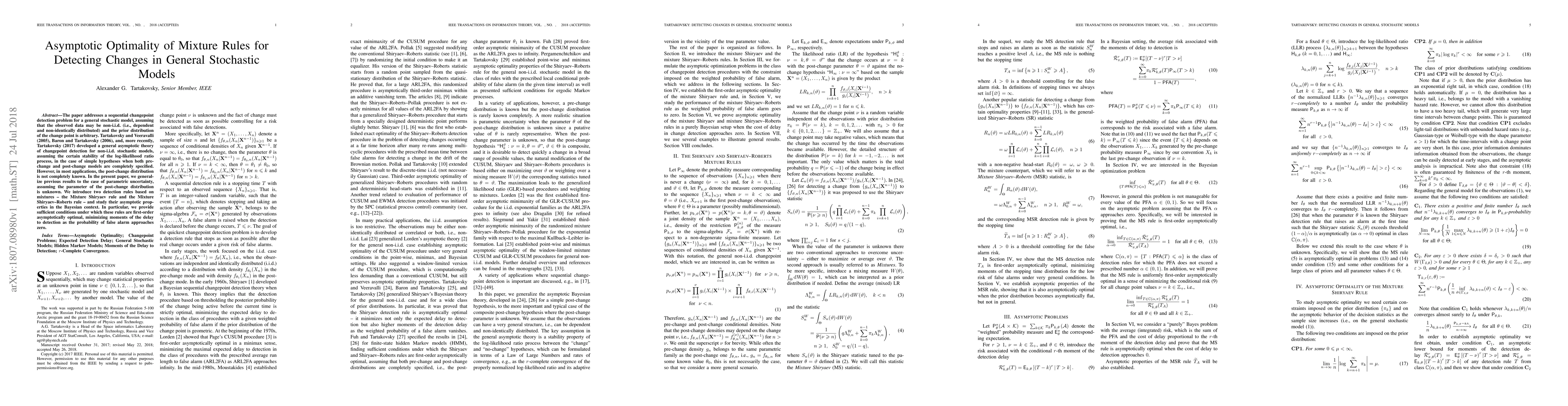 This paper develops new methods for detecting changes in general stochastic models, considering non-i.i.d. data and unknown post-change distributions, providing sufficient conditions for first-order asymptotic optimality of two mixture-based detection rules.