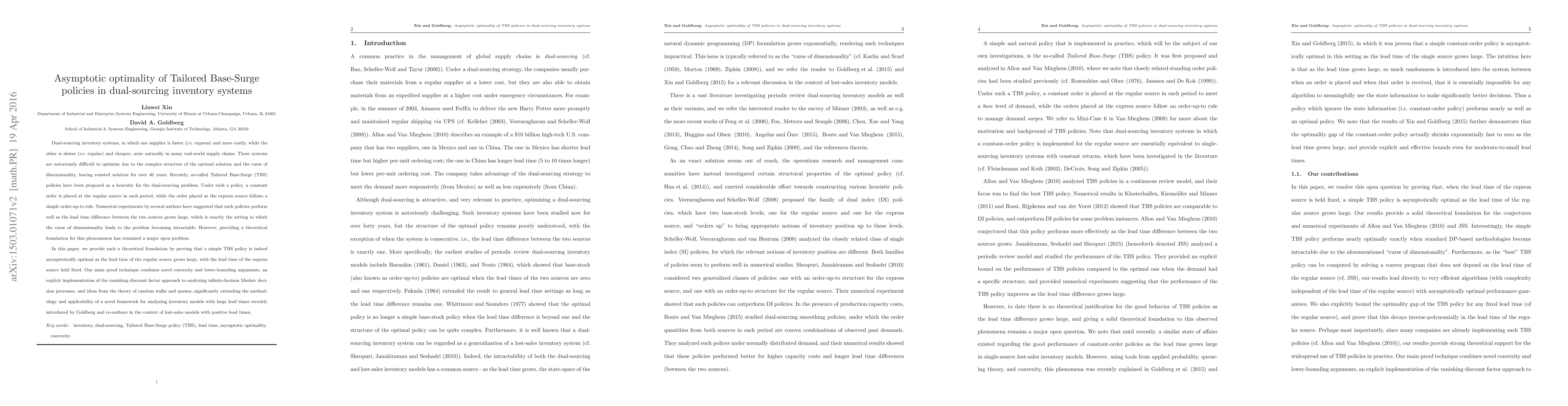 This paper proves the asymptotic optimality of Tailored Base-Surge (TBS) policies in dual-sourcing inventory systems where one supplier is faster and more expensive, and the other is slower and cheaper. The authors establish a theoretical foundation for TBS policies, demonstrating their optimality as the lead time of the regular source grows large, using novel convexity arguments and extending existing methodologies for analyzing inventory models.