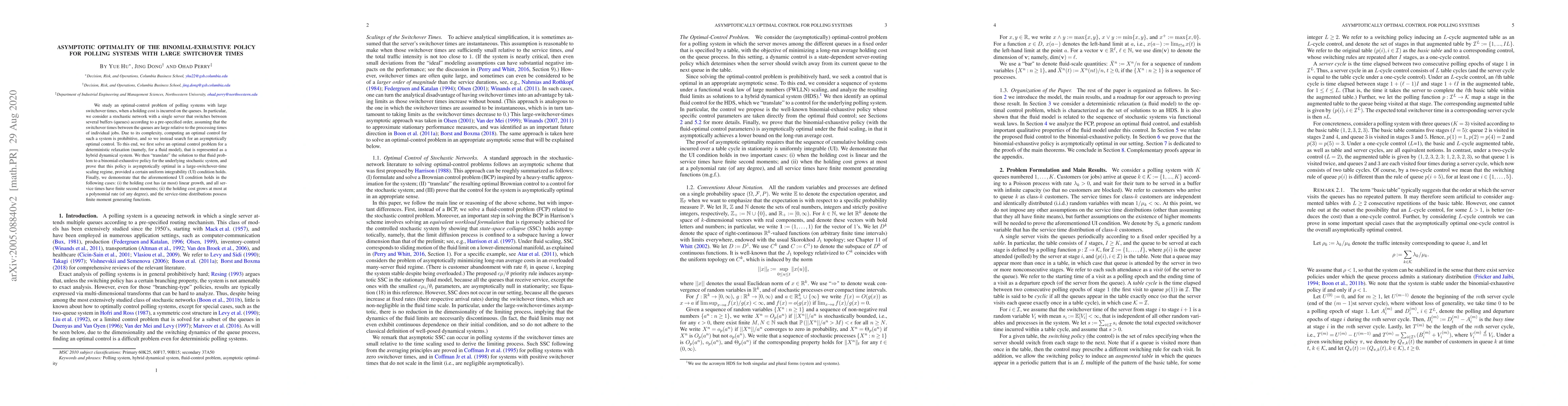A study on optimal control for polling systems with large switchover times finds an asymptotically optimal policy using a binomial-exhaustive approach, under certain uniform integrability conditions.