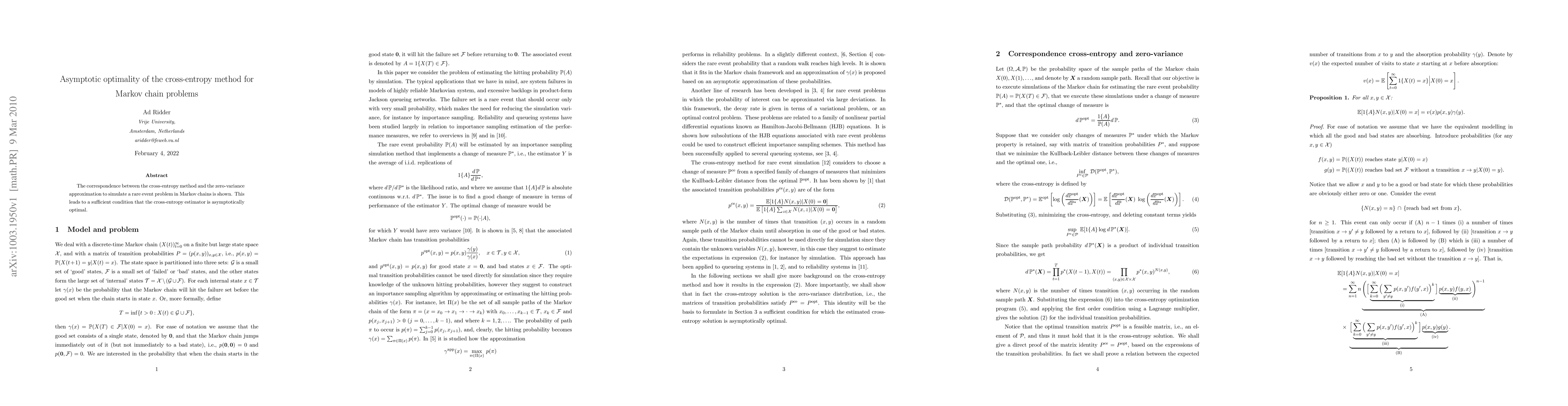 The correspondence between the cross-entropy method and the zero-variance approximation to simulate a rare event problem in Markov chains is shown. This leads to a sufficient condition that the cross-entropy estimator is asymptotically optimal.