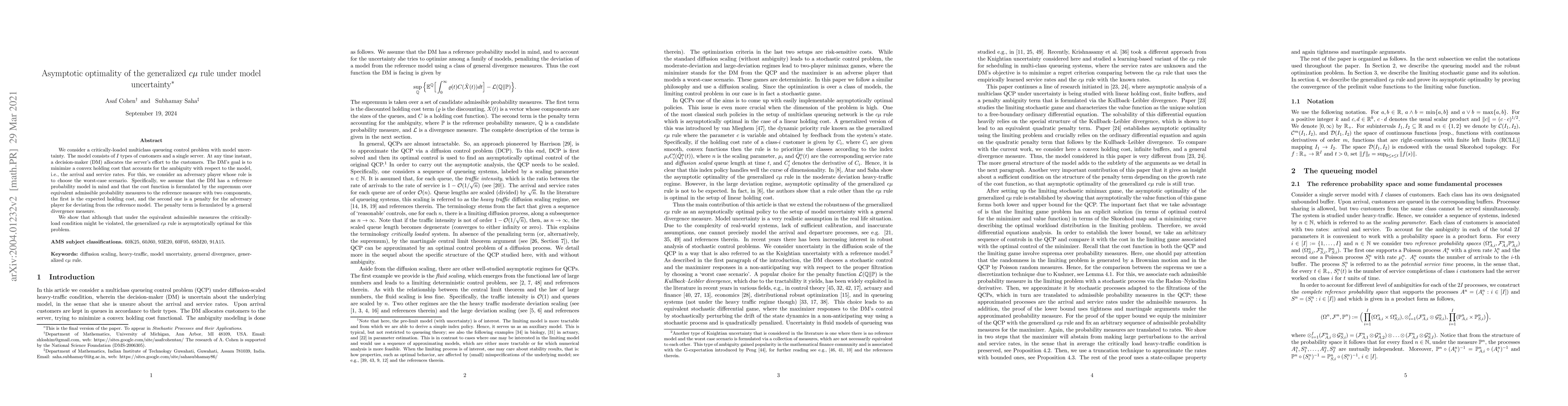 A study shows that a rule called the generalized $c extmu$ rule is asymptotically optimal for managing a multiclass queueing system with model uncertainty, despite potential violations of a critical load condition.