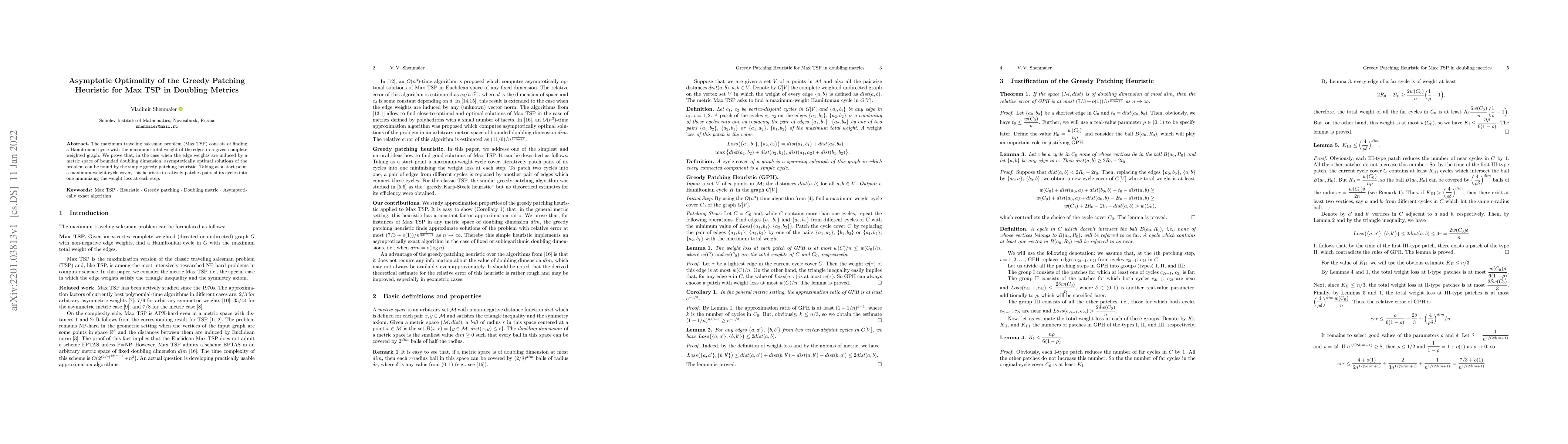 The maximum traveling salesman problem (Max~TSP) consists of finding a Hamiltonian cycle with the maximum total weight of the edges in a given complete weighted graph. We prove that, in the case when the edge weights are induced by a metric space of bounded doubling dimension, asymptotically optimal solutions of the problem can be found by the simple greedy patching heuristic. Taking as a start point a maximum-weight cycle cover, this heuristic iteratively patches pairs of its cycles into one minimizing the weight loss at each step.