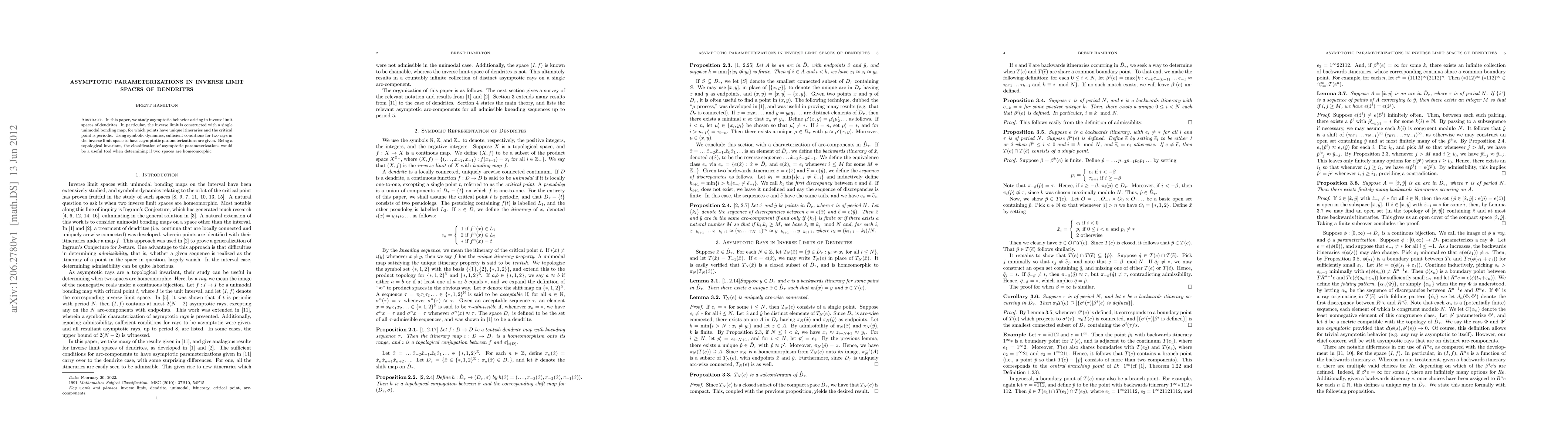 In this paper, we study asymptotic behavior arising in inverse limit spaces of dendrites. In particular, the inverse limit is constructed with a single unimodal bonding map, for which points have unique itineraries and the critical point is periodic. Using symbolic dynamics, sufficient conditions for two rays in the inverse limit space to have asymptotic parameterizations are given. Being a topological invariant, the classification of asymptotic parameterizations would be a useful tool when determining if two spaces are homeomorphic.