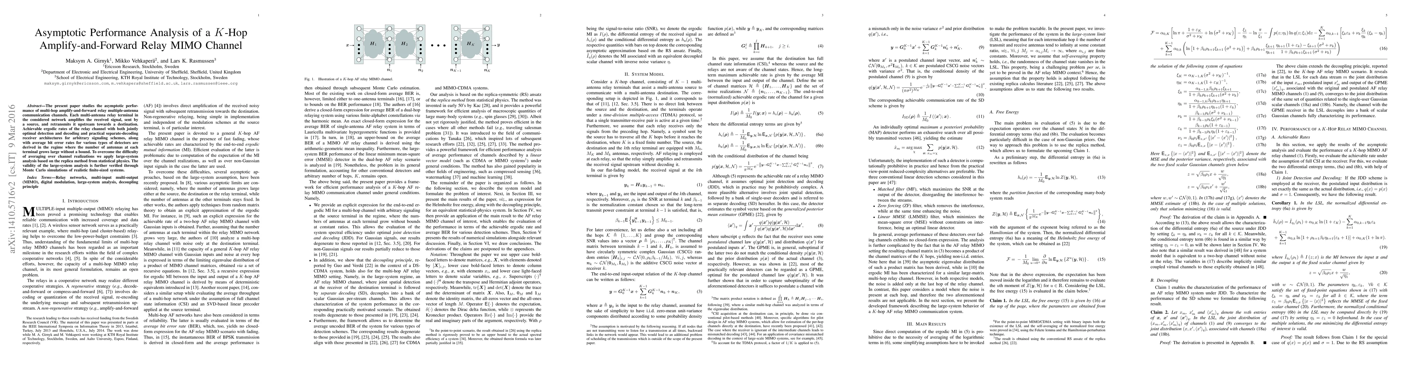 The present paper studies the asymptotic performance of multi-hop amplify-and-forward relay multiple-antenna communication channels. Each multi-antenna terminal in the network amplifies the received signal, sent by a source, and retransmits it upstream towards a destination. Achievable ergodic rates under both jointly optimal detection and decoding and practical separate decoding schemes for arbitrary signaling schemes, along with the average bit error rate for various receiver structures are derived in the regime where the number of antennas at each terminal grows large without a bound. To overcome the difficulty of averaging over channel realizations we apply large-system analysis based on the replica method from statistical physics. The validity of the large-system analysis is further verified through Monte Carlo simulations of realistic finite-sized systems.