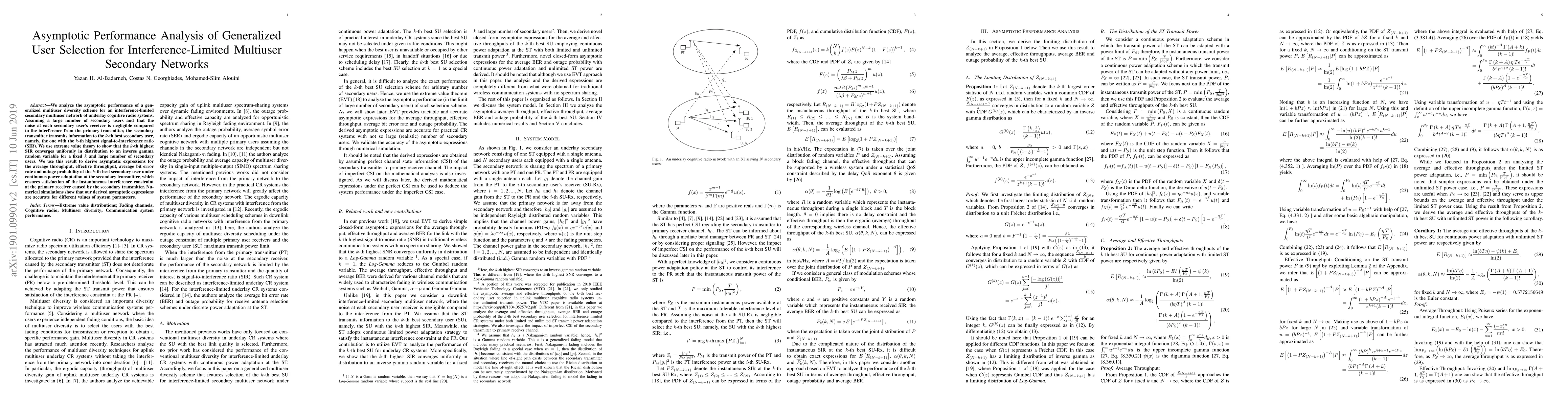 We analyze the asymptotic performance of a generalized multiuser diversity scheme for an interference-limited secondary multiuser network of underlay cognitive radio systems. Assuming a large number of secondary users and that the noise at each secondary user's receiver is negligible compared to the interference from the primary transmitter, the secondary transmitter transmits information to the $k$-th best secondary user, namely, the one with the $k$-th highest signal-to-interference ratio (SIR). We use extreme value theory to show that the $k$-th highest SIR converges uniformly in distribution to an inverse gamma random variable for a fixed $k$ and large number of secondary users. We use this result to derive asymptotic expressions for the average throughput, effective throughput, average bit error rate and outage probability of the $k$-th best secondary user under continuous power adaptation at the secondary transmitter, which ensures satisfaction of the instantaneous interference constraint at the primary receiver caused by the secondary transmitter. Numerical simulations show that our derived asymptotic expressions are accurate for different values of system parameters.