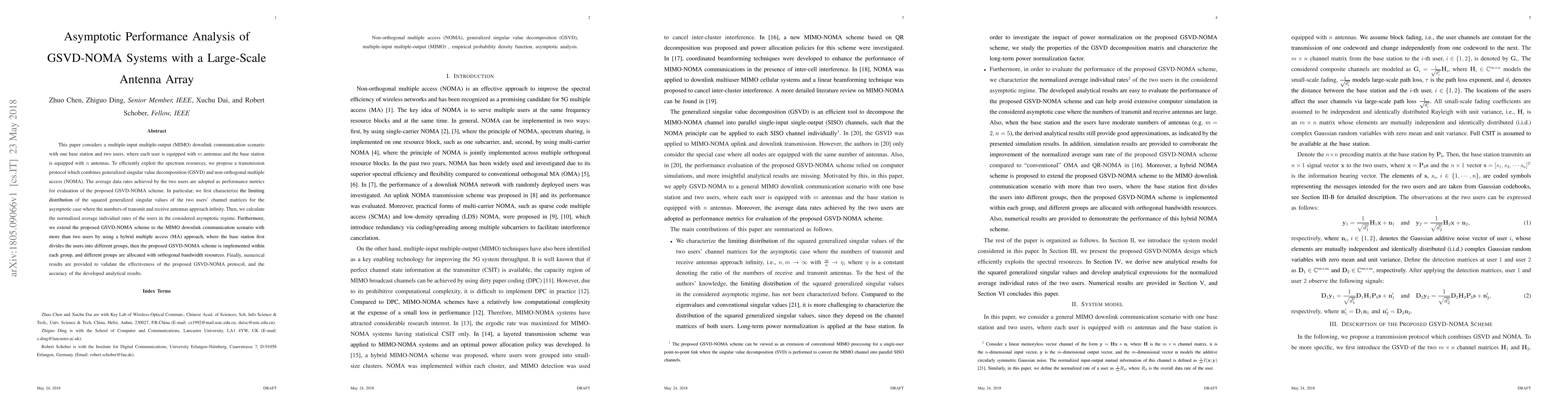 This paper analyzes the performance of a GSVD-NOMA system with a large-scale antenna array, showing improved average data rates for users in an asymptotic regime where transmit and receive antennas approach infinity.