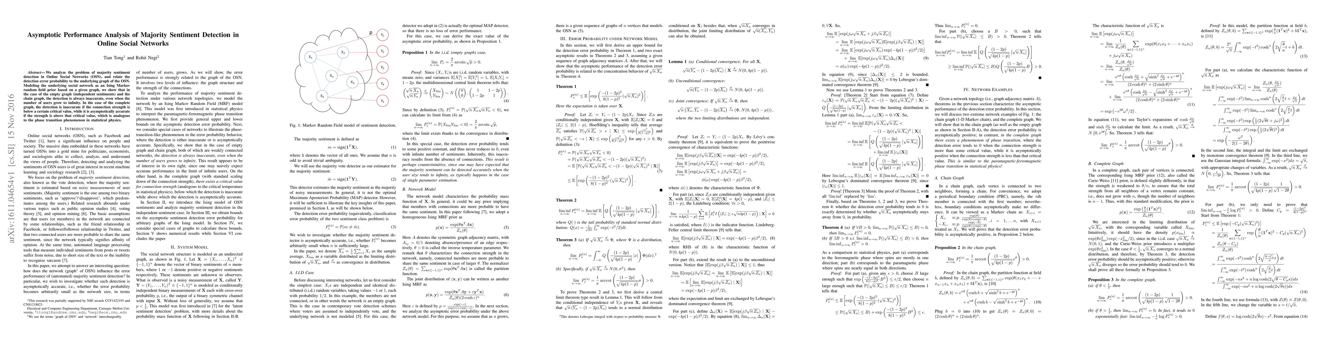 We analyze the problem of majority sentiment detection in Online Social Networks (OSN), and relate the detection error probability to the underlying graph of the OSN. Modeling the underlying social network as an Ising Markov random field prior based on a given graph, we show that in the case of the empty graph (independent sentiments) and the chain graph, the detection is always inaccurate, even when the number of users grow to infinity. In the case of the complete graph, the detection is inaccurate if the connection strength is below a certain critical value, while it is asymptotically accurate if the strength is above that critical value, which is analogous to the phase transition phenomenon in statistical physics.