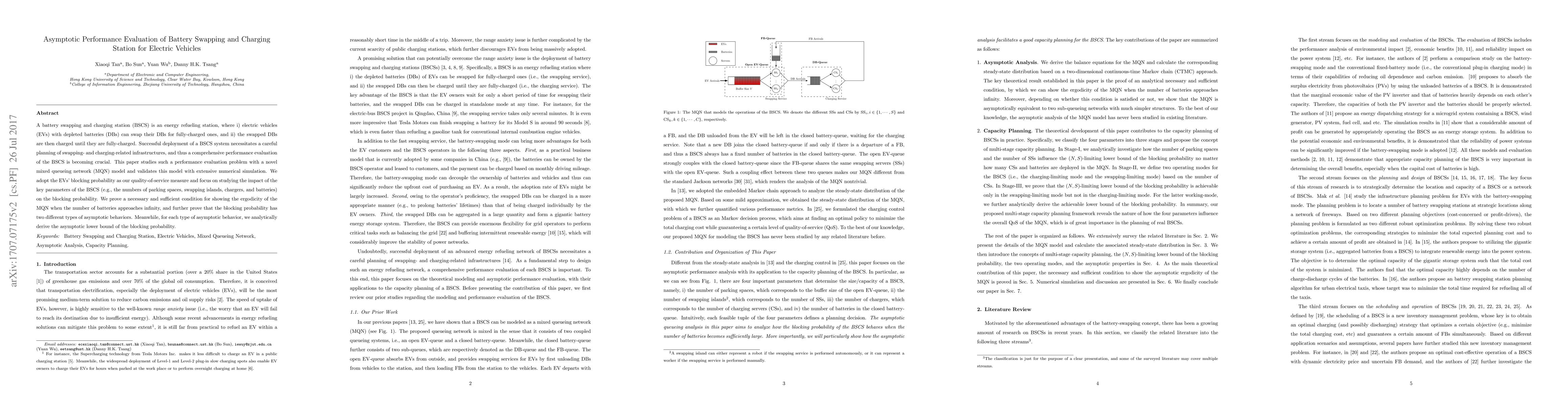 This paper evaluates the performance of battery swapping and charging stations (BSCS) for electric vehicles using a mixed queueing network model, focusing on the blocking probability as a service quality measure. It analyzes the impact of BSCS parameters on blocking probability and proves conditions for the ergodicity of the model, identifying two types of asymptotic behaviors and their respective lower bounds.