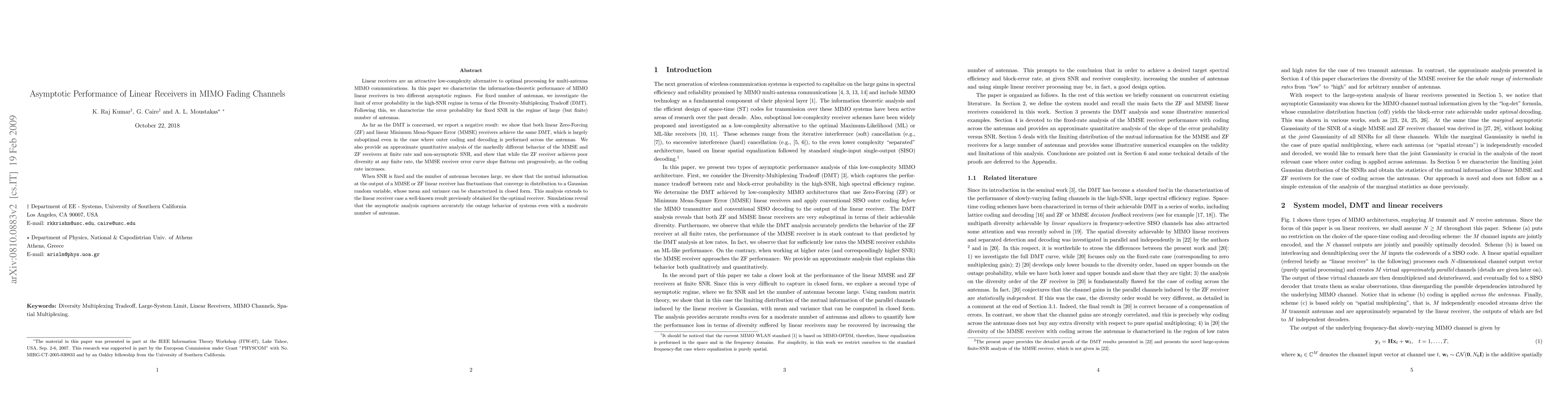 This paper explores the asymptotic performance of linear receivers in MIMO fading channels, showing that both linear Zero-Forcing and Minimum Mean-Square Error receivers achieve the same suboptimal Diversity-Multiplexing Tradeoff. It also demonstrates that while Zero-Forcing has poor diversity, Minimum Mean-Square Error's error curve flattens at higher rates. The study concludes with an analysis showing that MIMO linear receivers' mutual information converges to a Gaussian distribution as the number of antennas grows large.
