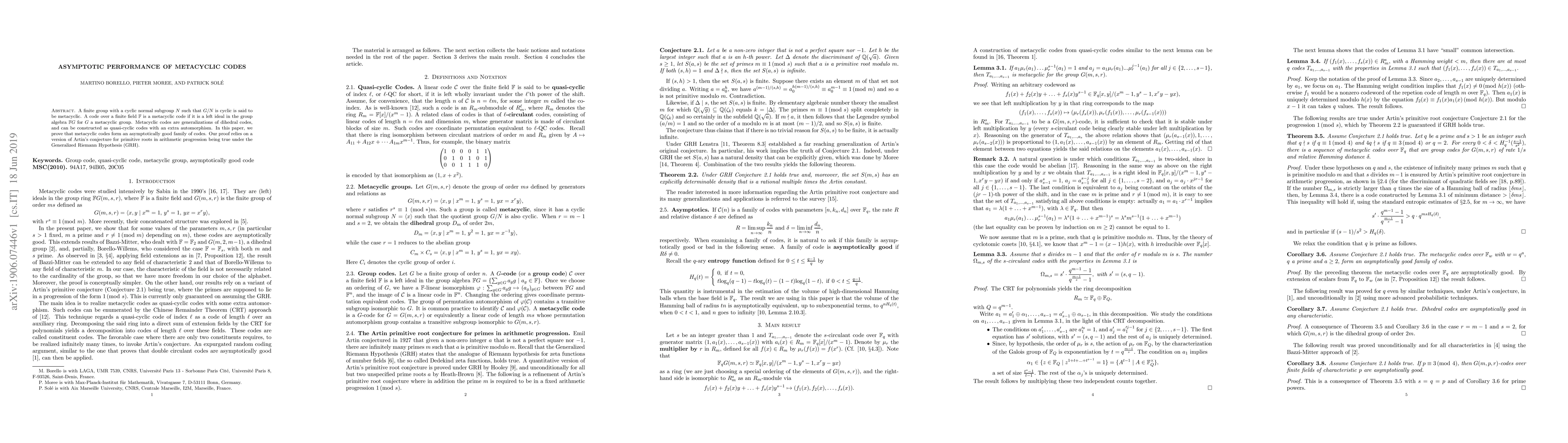 This paper demonstrates that metacyclic codes, which generalize dihedral codes and can be constructed with quasi-cyclic codes and extra automorphisms, form an asymptotically good family of codes. The proof hinges on the validity of a version of Artin's conjecture under the Generalized Riemann Hypothesis (GRH).