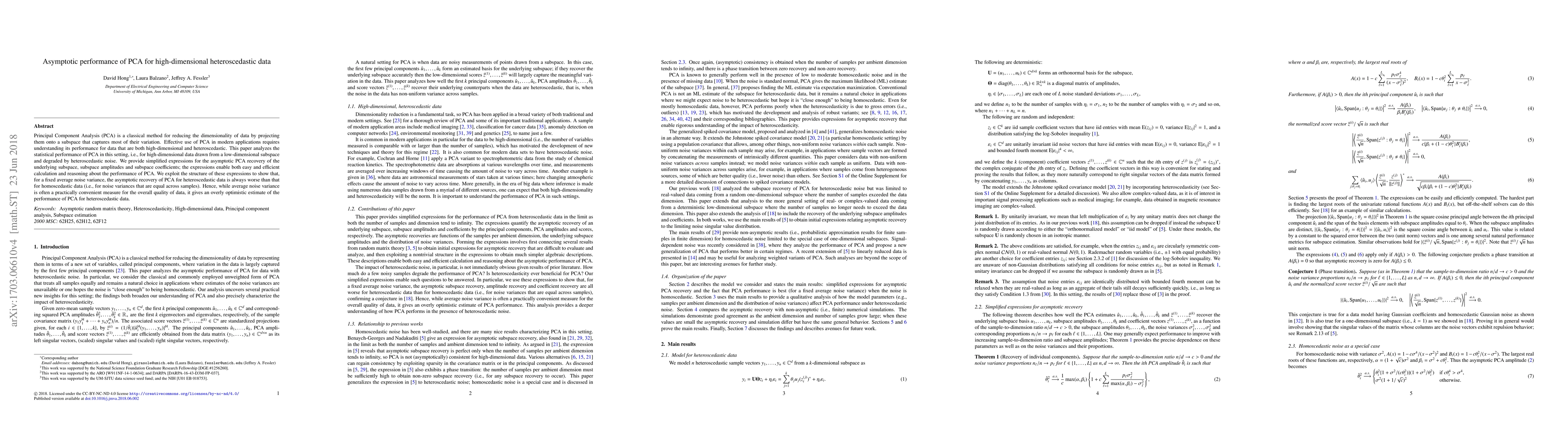This paper analyzes PCA's asymptotic performance for high-dimensional, heteroscedastic data, providing expressions for PCA recovery of underlying subspaces. It concludes that PCA's performance degrades for heteroscedastic noise compared to homoscedastic noise, despite similar average noise variances.