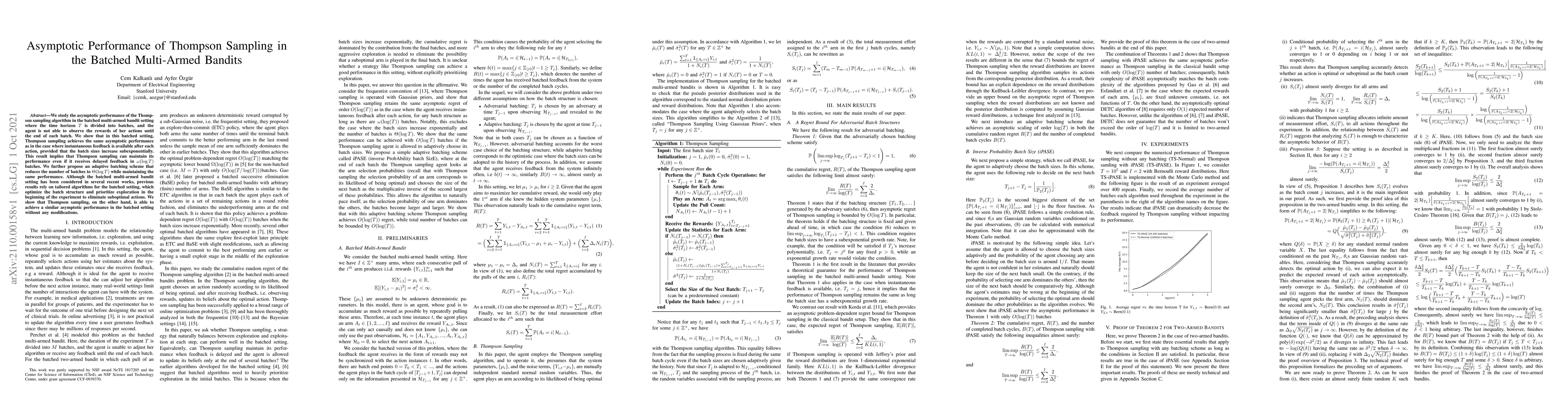 This paper investigates the asymptotic performance of Thompson sampling in batched multi-armed bandits, demonstrating it maintains performance with delayed feedback as batch sizes increase subexponentially. An adaptive batching scheme reduces batch count to $\Theta(\log T)$ while preserving performance.