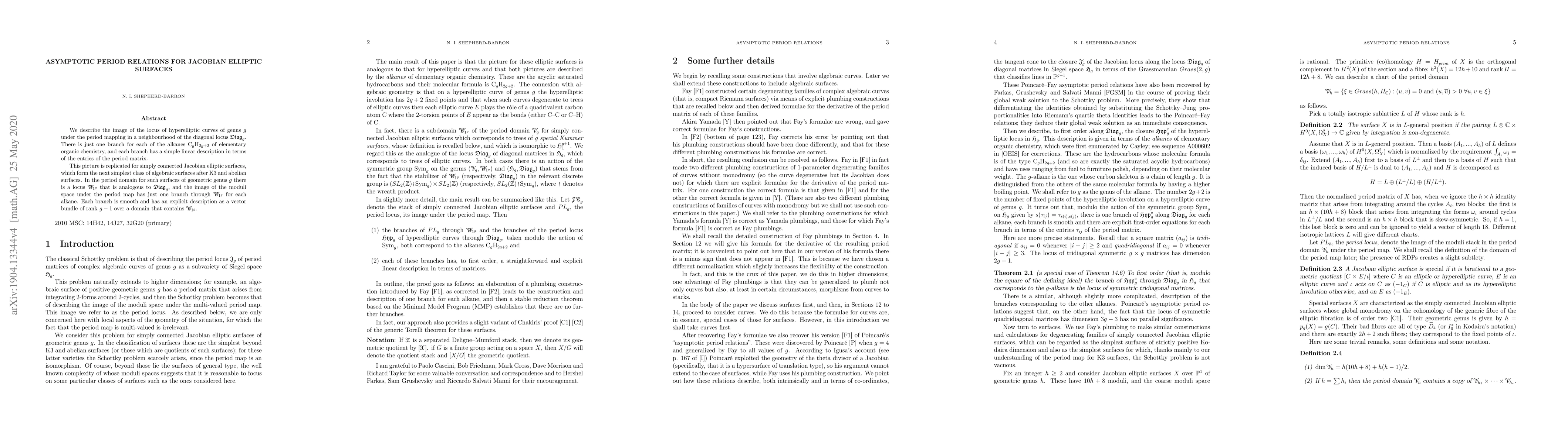 We find an asymptotic description of the period locus of simply connected Jacobian elliptic surfaces and of the period locus of hyperelliptic curves. The two descriptions are essentially the same, and are given by the alkanes of organic chemistry.