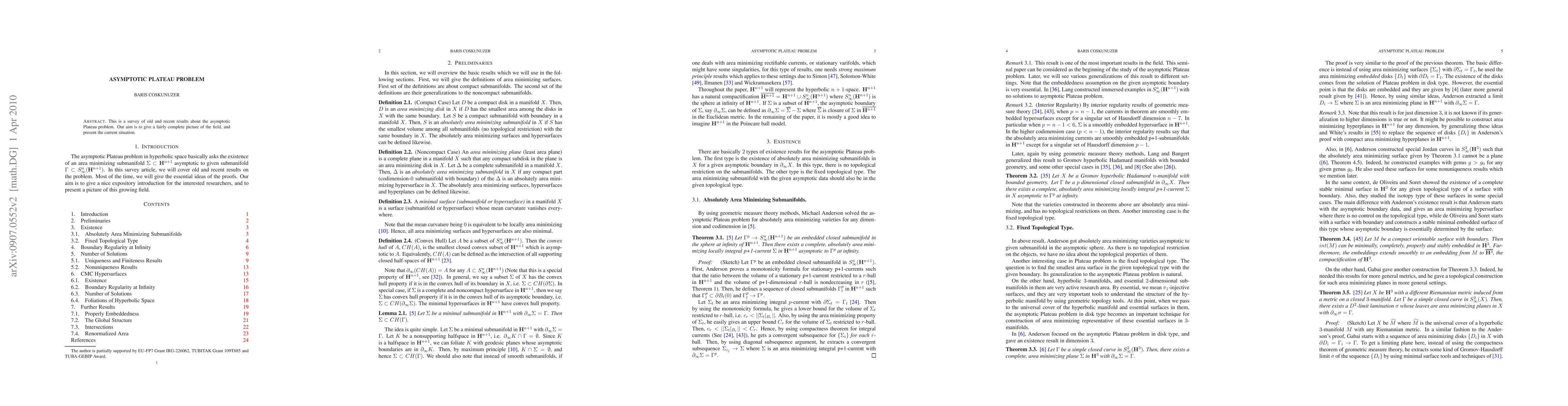 This paper surveys both historical and contemporary findings on the asymptotic Plateau problem, aiming to comprehensively depict the current state of the field. It presents an up-to-date overview of the problem and its ongoing developments.