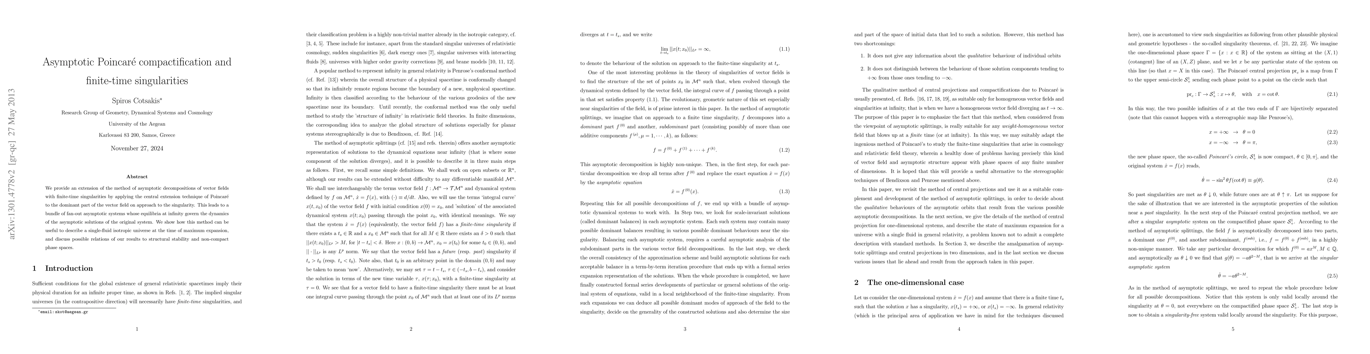 We provide an extension of the method of asymptotic decompositions of vector fields with finite-time singularities by applying the central extension technique of Poincar\'e to the dominant part of the vector field on approach to the singularity. This leads to a bundle of fan-out asymptotic systems whose equilibria at infinity govern the dynamics of the asymptotic solutions of the original system. We show how this method can be useful to describe a single-fluid isotropic universe at the time of maximum expansion, and discuss possible relations of our results to structural stability and non-compact phase spaces.
