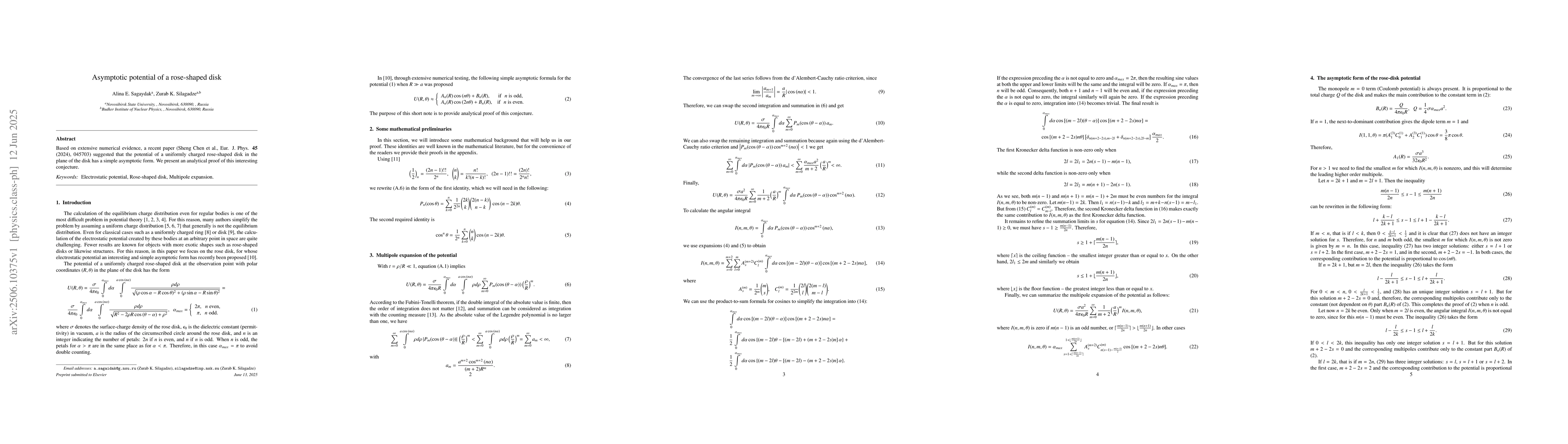 Researchers provide an analytical proof that the potential of a uniformly charged rose-shaped disk has a simple asymptotic form, confirming previous numerical evidence.