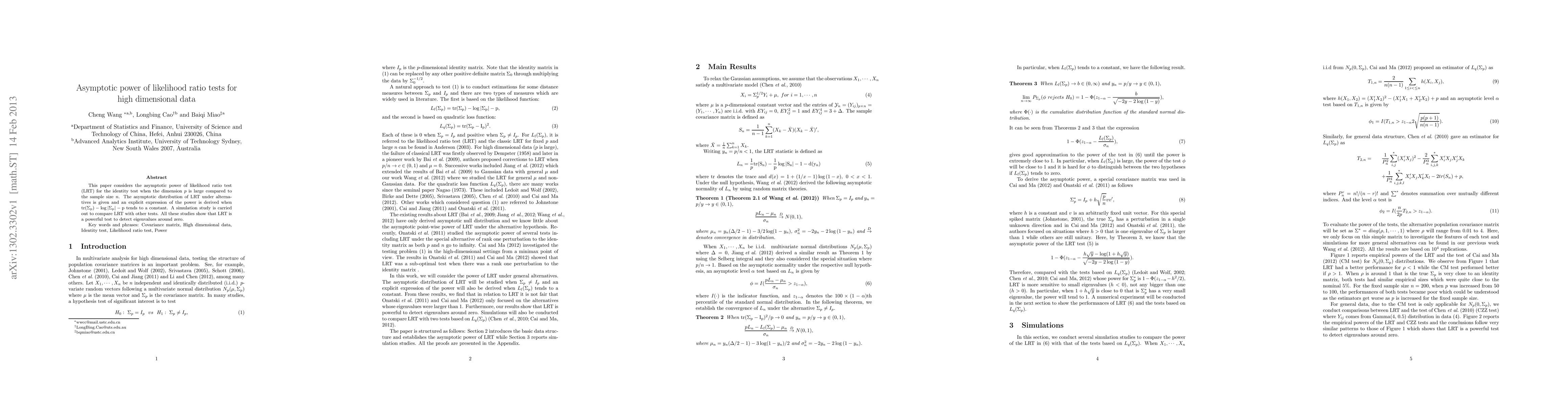 This paper investigates the asymptotic power of likelihood ratio tests (LRT) for high-dimensional data where the dimension p exceeds the sample size n. It derives an explicit expression for LRT power under alternative hypotheses and demonstrates through simulations that LRT is effective in detecting eigenvalues near zero.