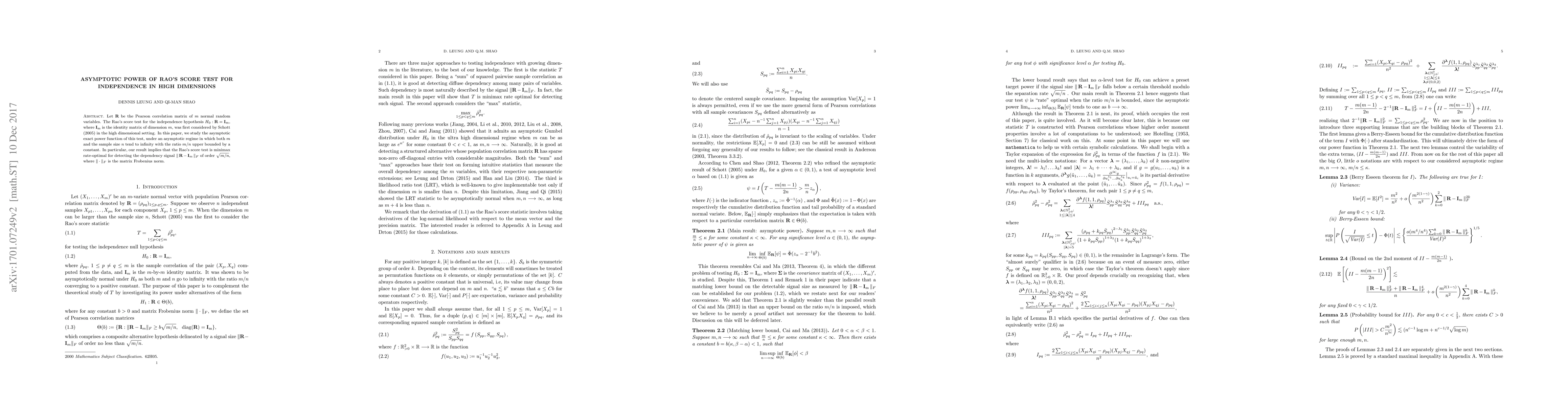 This paper investigates the asymptotic minimax power of Rao's score test for assessing independence in high-dimensional settings, demonstrating its rate-optimality in detecting dependency signals of order $\sqrt{m/n}$ as both $m$ and $n$ tend to infinity with $m/n$ bounded by a constant.
