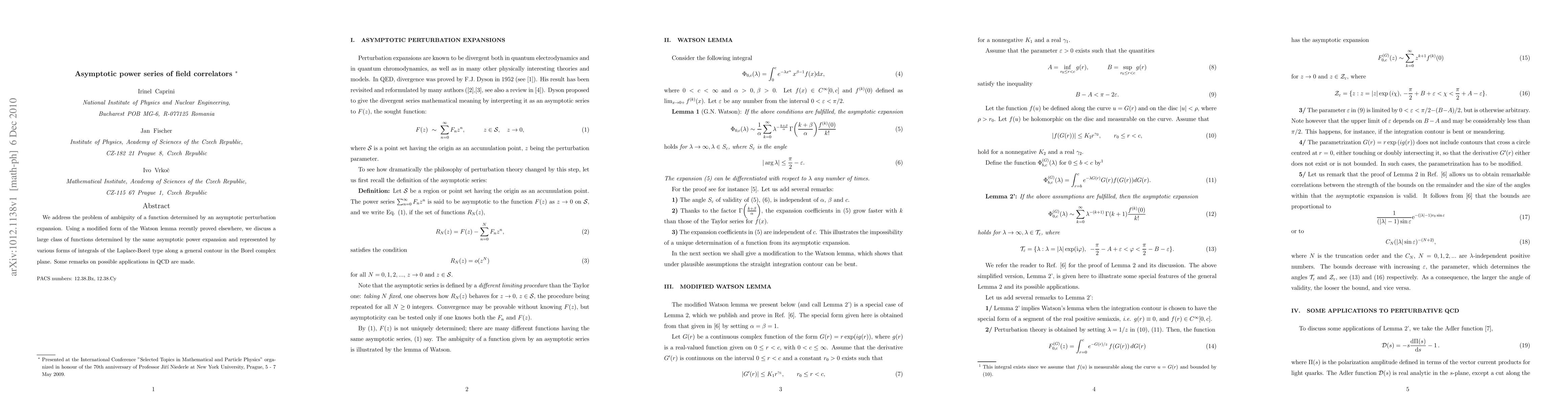 We address the problem of ambiguity of a function determined by an asymptotic perturbation expansion. Using a modified form of the Watson lemma recently proved elsewhere, we discuss a large class of functions determined by the same asymptotic power expansion and represented by various forms of integrals of the Laplace-Borel type along a general contour in the Borel complex plane. Some remarks on possible applications in QCD are made.