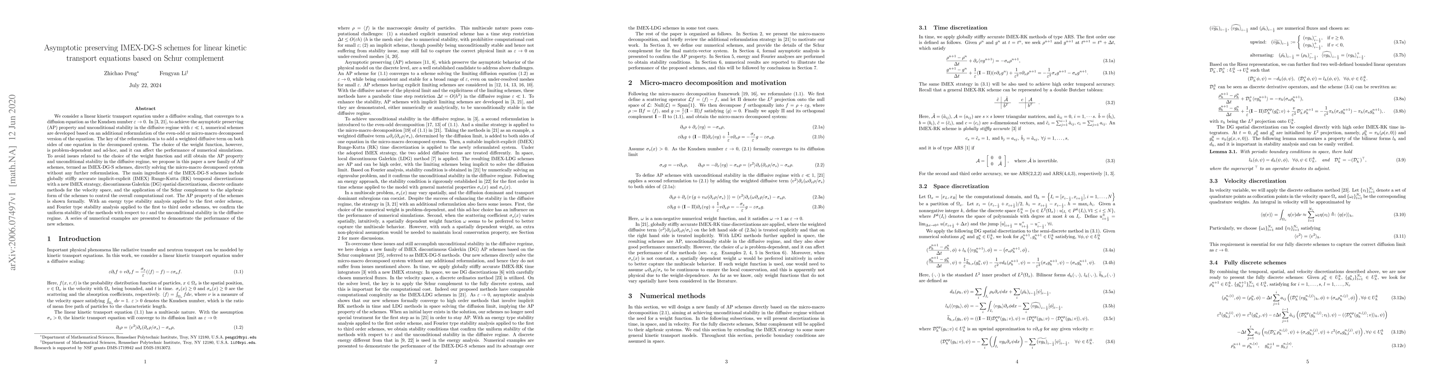 This paper proposes new IMEX-DG-S schemes for solving linear kinetic transport equations under diffusive scaling, ensuring asymptotic preserving properties and unconditional stability without relying on problem-dependent weight functions. The schemes utilize implicit-explicit Runge-Kutta methods, discontinuous Galerkin spatial discretizations, and Schur complement techniques to maintain stability and control computational costs.