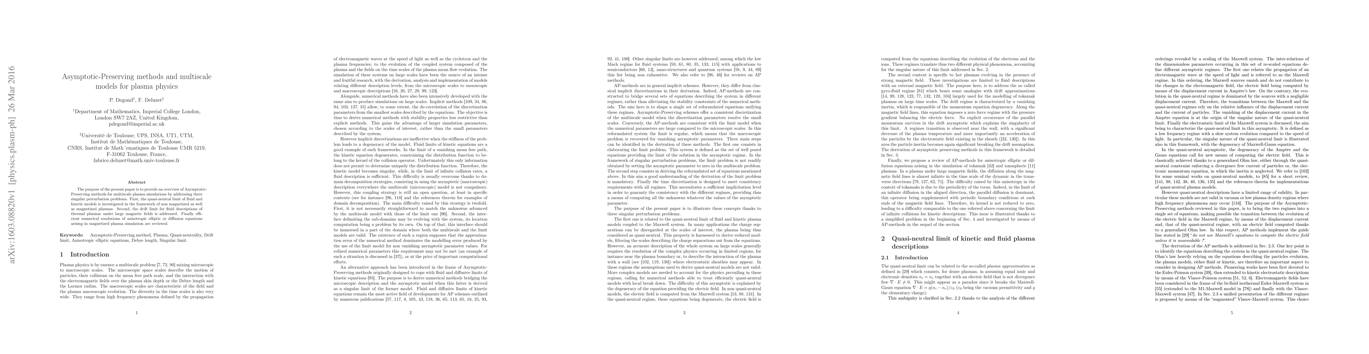 This paper reviews Asymptotic-Preserving methods for multiscale plasma simulations, focusing on quasi-neutral and drift limits in fluid and kinetic models, and efficient numerical solutions for anisotropic equations in magnetized plasmas.