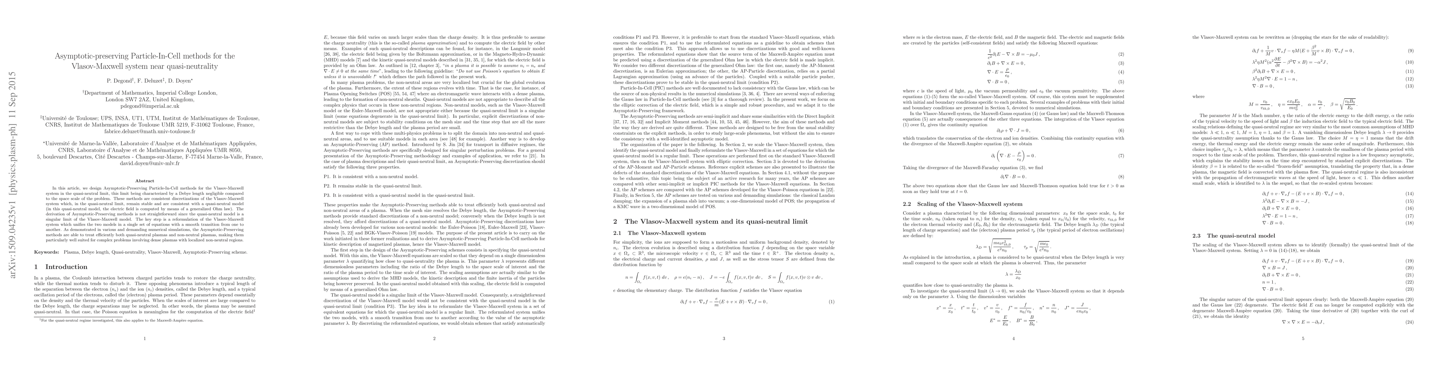 This paper develops Asymptotic-Preserving Particle-In-Cell methods for the Vlasov-Maxwell system in quasi-neutral plasmas, ensuring stability and accuracy in the transition from full to quasi-neutral models, as validated by rigorous numerical simulations.