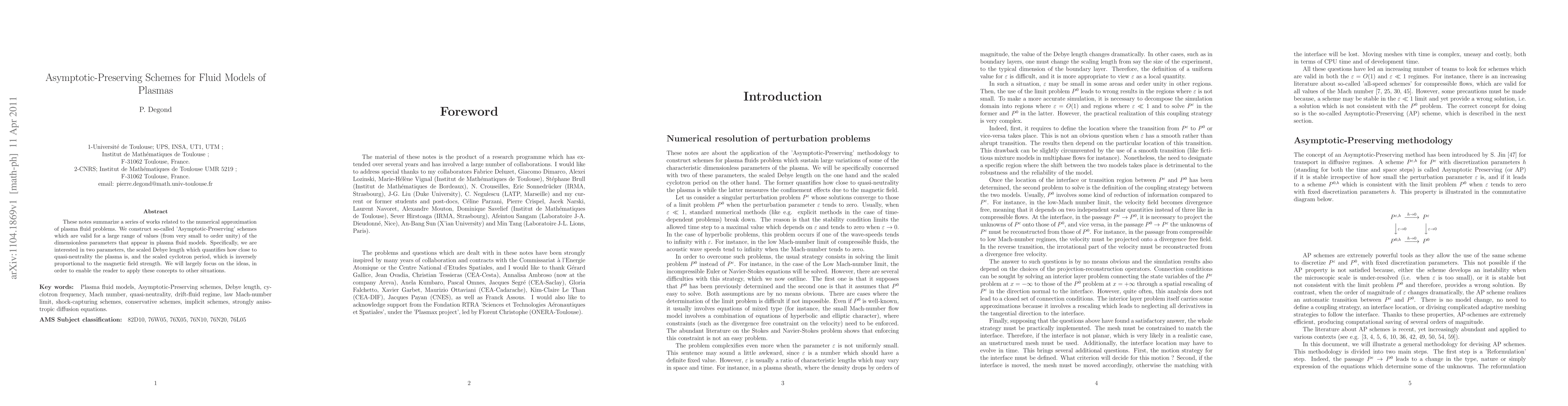 These notes summarize a series of works related to the numerical approximation of plasma fluid problems. We construct so-called 'Asymptotic-Preserving' schemes which are valid for a large range of values (from very small to order unity) of the dimensionless parameters that appear in plasma fluid models. Specifically, we are interested in two parameters, the scaled Debye length which quantifies how close to quasi-neutrality the plasma is, and the scaled cyclotron period, which is inversely proportional to the magnetic field strength. We will largely focus on the ideas, in order to enable the reader to apply these concepts to other situations.