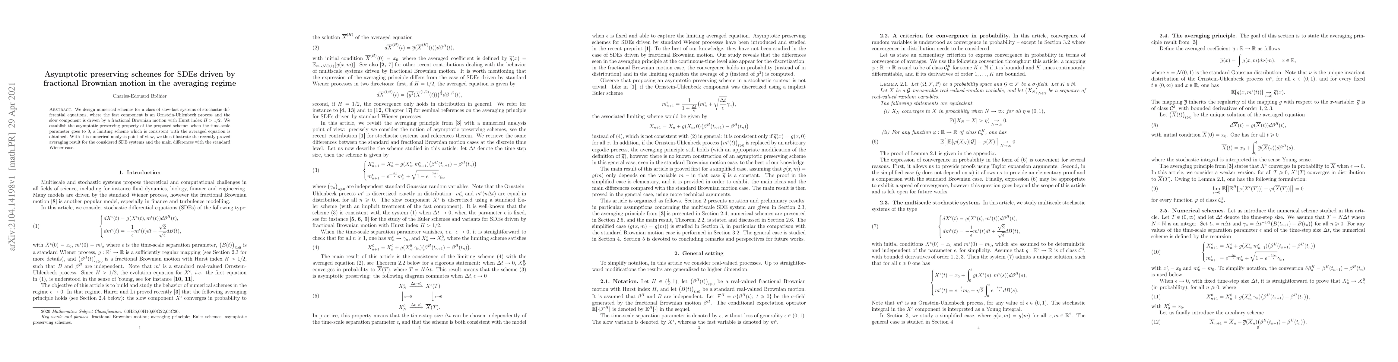 This paper proposes numerical schemes for slow-fast stochastic differential equations driven by fractional Brownian motion, demonstrating their asymptotic preserving properties. The schemes accurately reflect the averaged equation as the time-scale parameter approaches zero, highlighting differences from the standard Wiener case.