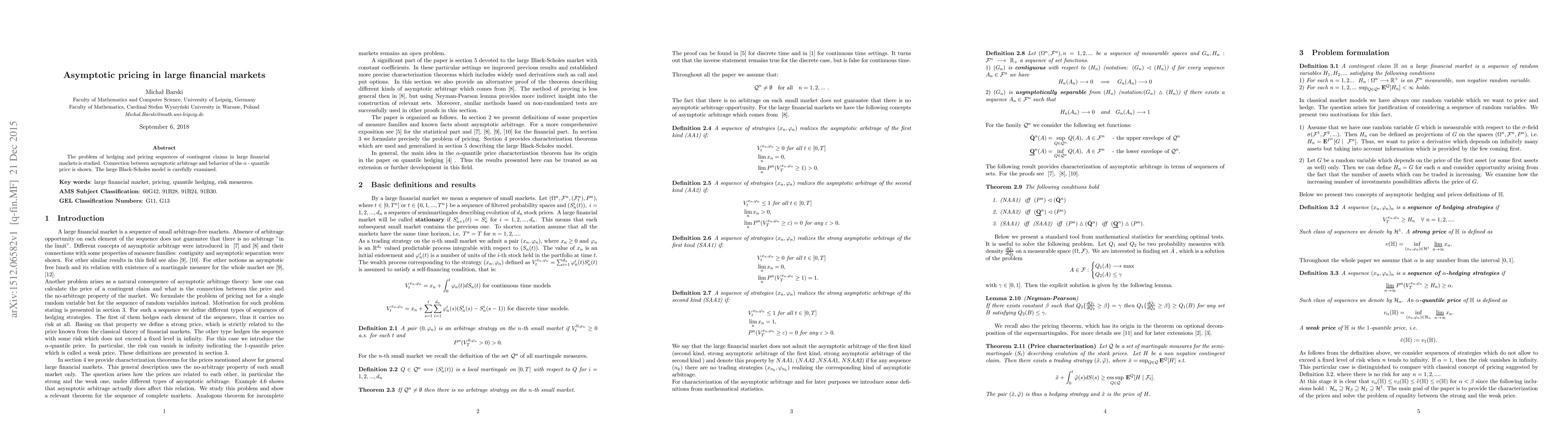 The problem of hedging and pricing sequences of contingent claims in large financial markets is studied. Connection between asymptotic arbitrage and behavior of the $\alpha$~-~quantile price is shown. The large Black-Scholes model is carefully examined.