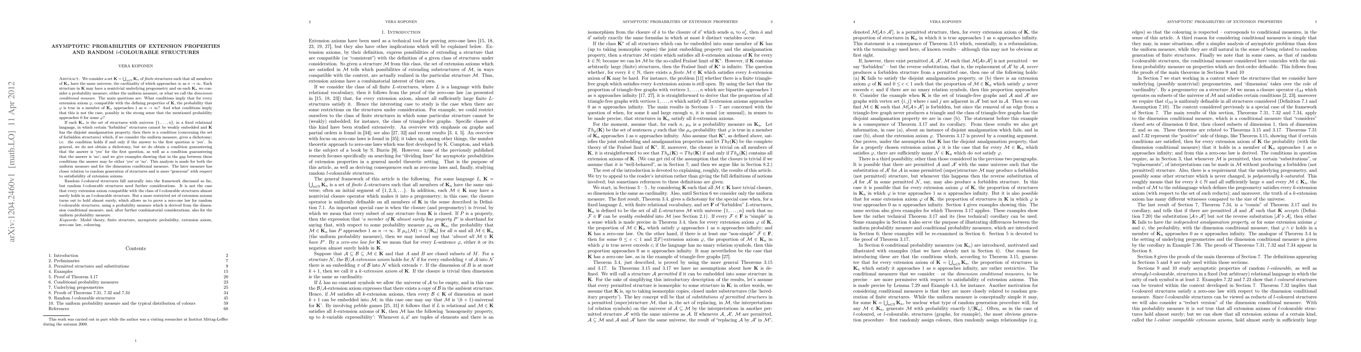 The paper investigates the asymptotic probabilities of extension properties in a set of finite structures approaching infinity. It examines conditions that guarantee these probabilities approach 1 or 0 for various measures.