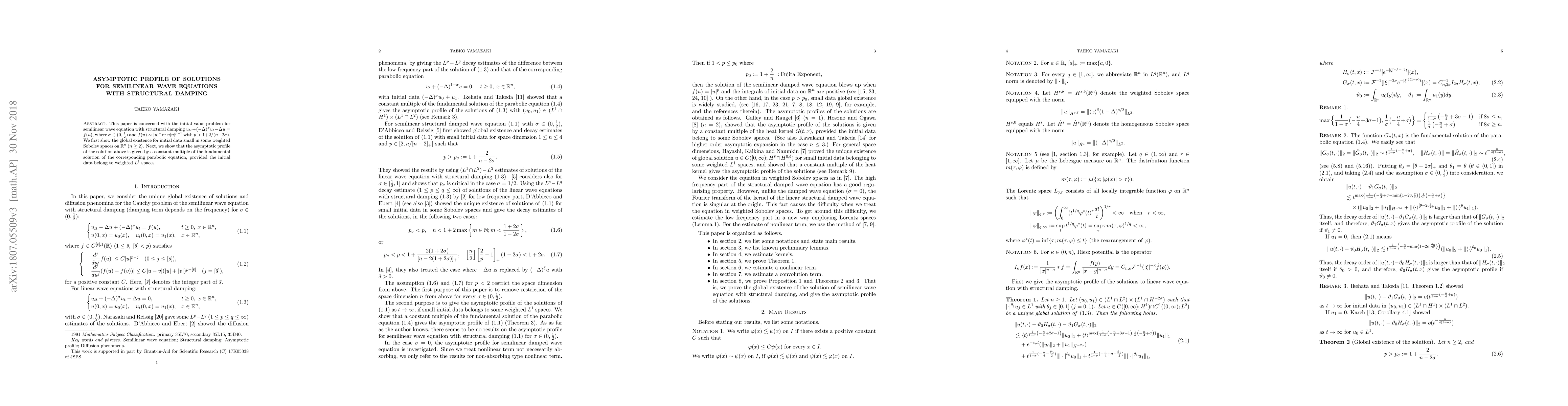 This paper investigates global existence and asymptotic profiles for solutions to semilinear wave equations with structural damping, showing that initial data small in certain spaces lead to constant multiple of fundamental solution profiles.