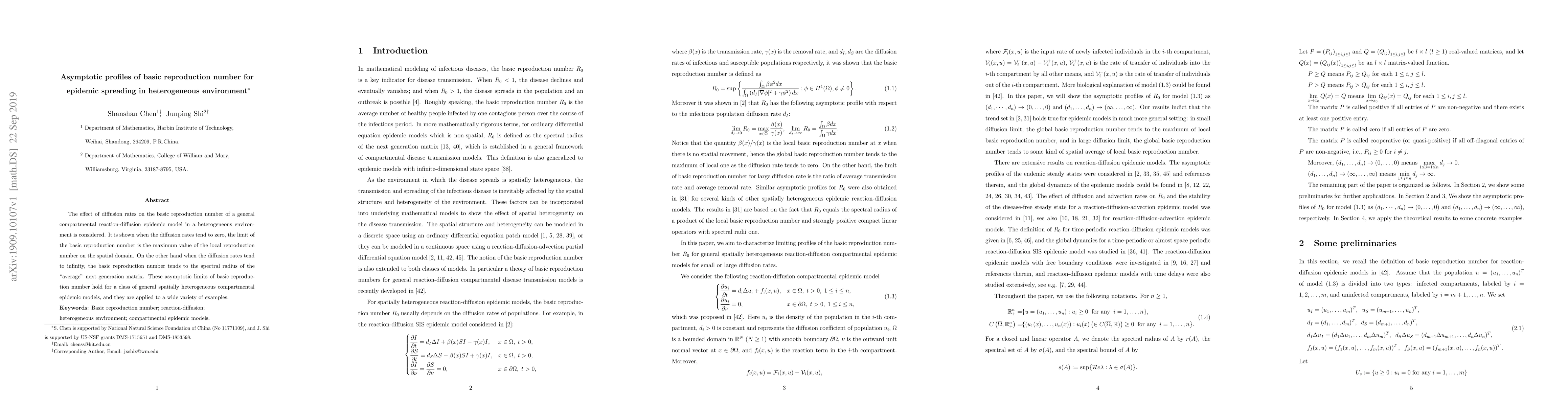 This paper investigates the impact of diffusion rates on the basic reproduction number in a reaction-diffusion epidemic model across a heterogeneous environment. It finds that low diffusion rates lead to a basic reproduction number equal to the maximum local reproduction number, while high diffusion rates result in it converging to the spectral radius of the average next generation matrix.