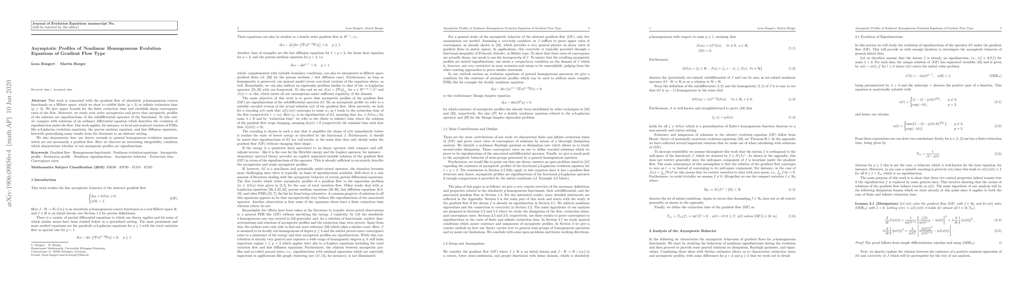 This work is concerned with the gradient flow of absolutely $p$-homogeneous convex functionals on a Hilbert space, which we show to exhibit finite ($p<2$) or infinite extinction time ($p \geq 2$). We give upper bounds for the finite extinction time and establish convergence rates of the flow. Moreover, we study next order asymptotics and prove that asymptotic profiles of the solution are eigenfunctions of the subdifferential operator of the functional. To this end, we compare with solutions of an ordinary differential equation which describes the evolution of eigenfunction under the flow. Our work applies, for instance, to local and nonlocal versions of PDEs like $p$-Laplacian evolution equations, the porous medium equation, and fast diffusion equations, herewith generalizing many results from the literature to an abstract setting. We also demonstrate how our theory extends to general homogeneous evolution equations which are not necessarily a gradient flow. Here we discover an interesting integrability condition which characterizes whether or not asymptotic profiles are eigenfunctions.