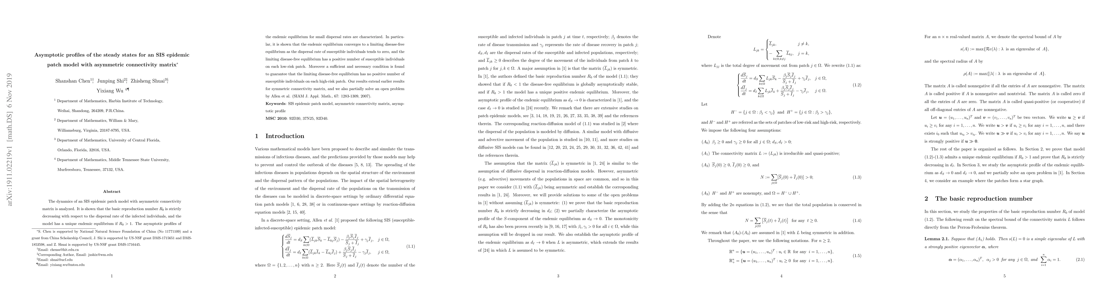 The dynamics of an SIS epidemic patch model with asymmetric connectivity matrix is analyzed. It is shown that the basic reproduction number $R_0$ is strictly decreasing with respect to the dispersal rate of the infected individuals, and the model has a unique endemic equilibrium if $R_0>1$. The asymptotic profiles of the endemic equilibrium for small dispersal rates are characterized. In particular, it is shown that the endemic equilibrium converges to a limiting disease-free equilibrium as the dispersal rate of susceptible individuals tends to zero, and the limiting disease-free equilibrium has a positive number of susceptible individuals on each low-risk patch. Moreover a sufficient and necessary condition is found to guarantee that the limiting disease-free equilibrium has no positive number of susceptible individuals on each high-risk patch. Our results extend earlier results for symmetric connectivity matrix, and we also partially solve an open problem by Allen et al. (SIAM J. Appl. Math., 67: 1283-1309, 2007).