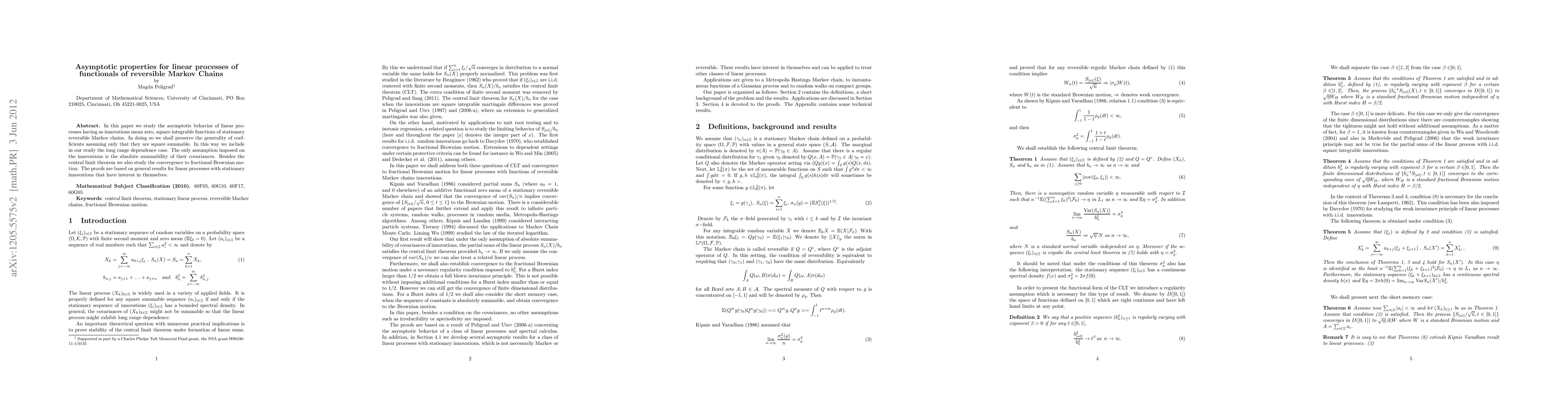 In this paper we study the asymptotic behavior of linear processes having as innovations mean zero, square integrable functions of stationary reversible Markov chains. In doing so we shall preserve the generality of coefficients assuming only that they are square summable. In this way we include in our study the long range dependence case. The only assumption imposed on the innovations is the absolute summability of their covariances. Besides the central limit theorem we also study the convergence to fractional Brownian motion. The proofs are based on general results for linear processes with stationary innovations that have interest in themselves.