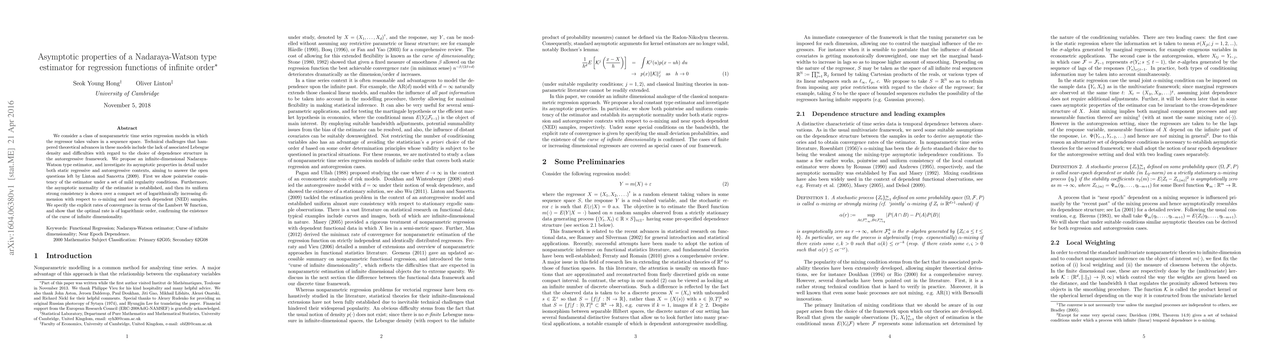 We consider a class of nonparametric time series regression models in which the regressor takes values in a sequence space. Technical challenges that hampered theoretical advances in these models include the lack of associated Lebesgue density and difficulties with regard to the choice of dependence structure in the autoregressive framework. We propose an infinite-dimensional Nadaraya-Watson type estimator, and investigate its asymptotic properties in detail under both static regressive and autoregressive contexts, aiming to answer the open questions left by Linton and Sancetta (2009). First we show pointwise consistency of the estimator under a set of mild regularity conditions. Furthermore, the asymptotic normality of the estimator is established, and then its uniform strong consistency is shown over a compact set of logarithmically increasing dimension with respect to $\alpha$-mixing and near epoch dependent (NED) samples. We specify the explicit rates of convergence in terms of the Lambert W function, and show that the optimal rate is of logarithmic order, confirming the existence of the curse of infinite dimensionality.