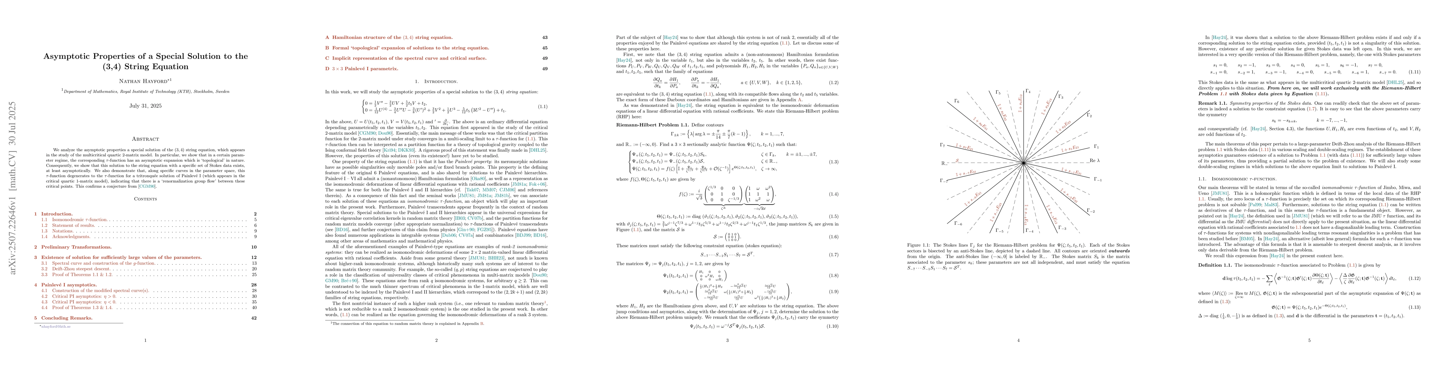 We analyze the asymptotic properties a special solution of the $(3,4)$ string equation, which appears in the study of the multicritical quartic $2$-matrix model. In particular, we show that in a certain parameter regime, the corresponding $\tau$-function has an asymptotic expansion which is `topological' in nature. Consequently, we show that this solution to the string equation with a specific set of Stokes data exists, at least asymptotically. We also demonstrate that, along specific curves in the parameter space, this $\tau$-function degenerates to the $\tau$-function for a tritronqu\'{e}e solution of Painlev\'{e} I (which appears in the critical quartic $1$-matrix model), indicating that there is a `renormalization group flow' between these critical points. This confirms a conjecture from [1]. [1] The Ising model, the Yang-Lee edge singularity, and 2D quantum gravity, C. Crnkovi\'{c}, P. Ginsparg, G. Moore. Phys. Lett. B 237 2 (1990)