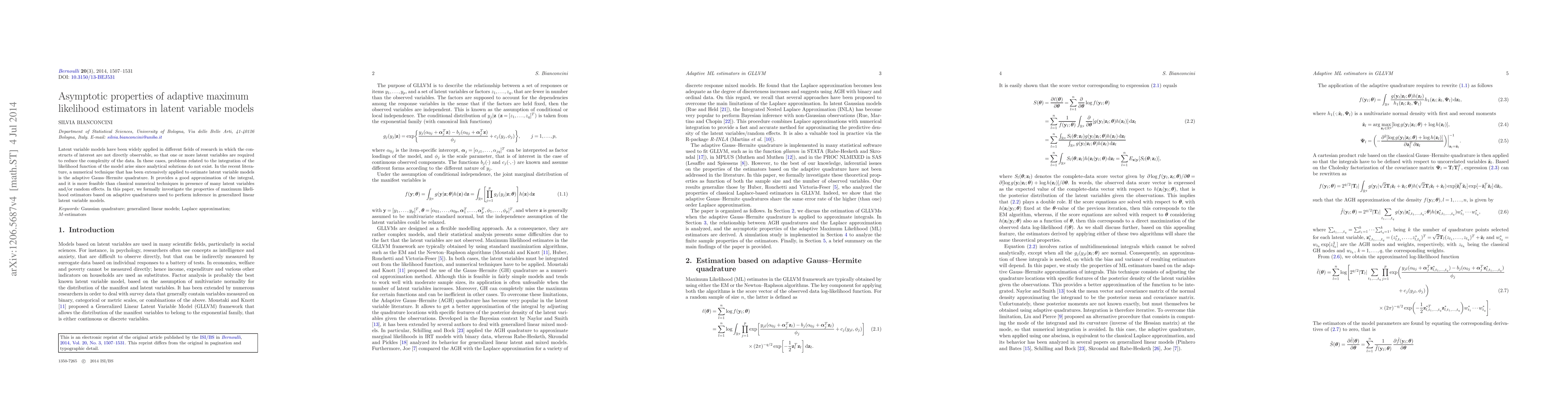 This paper investigates the asymptotic properties of adaptive maximum likelihood estimators in generalized linear latent variable models, focusing on the use of adaptive Gauss-Hermite quadrature to approximate the likelihood function, and demonstrates its feasibility and effectiveness in complex scenarios with many latent variables.