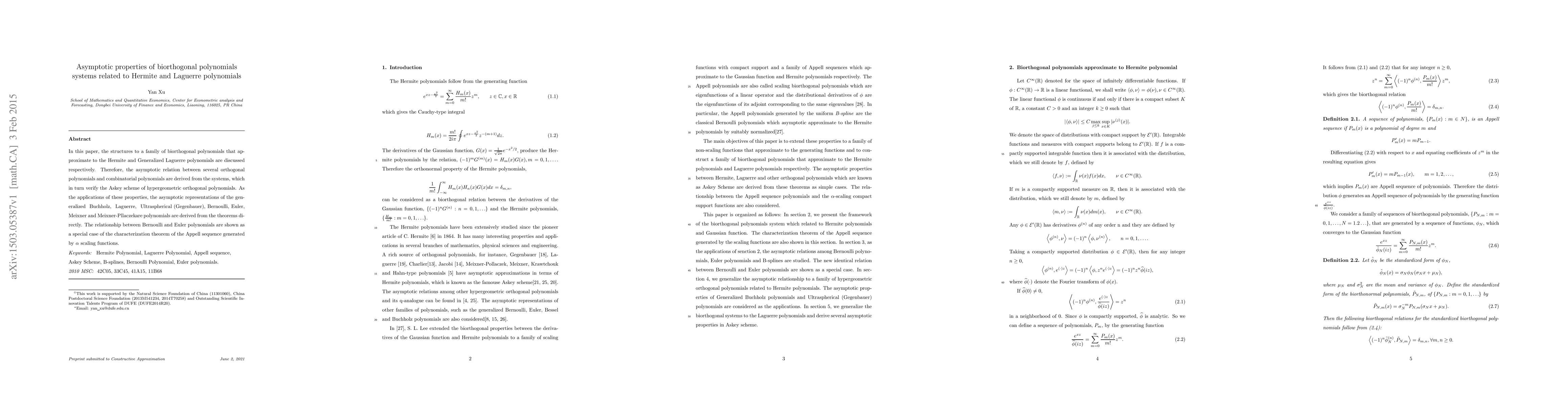 In this paper, the structures to a family of biorthogonal polynomials that approximate to the Hermite and Generalized Laguerre polynomials are discussed respectively. Therefore, the asymptotic relation between several orthogonal polynomials and combinatorial polynomials are derived from the systems, which in turn verify the Askey scheme of hypergeometric orthogonal polynomials. As the applications of these properties, the asymptotic representations of the generalized Buchholz, Laguerre, Ultraspherical(Gegenbauer), Bernoulli, Euler, Meixner and Meixner-Pllaczekare polynomials are derived from the theorems directly. The relationship between Bernoulli and Euler polynomials are shown as a special case of the characterization theorem of the Appell sequence generated by $\alpha$ scaling functions.