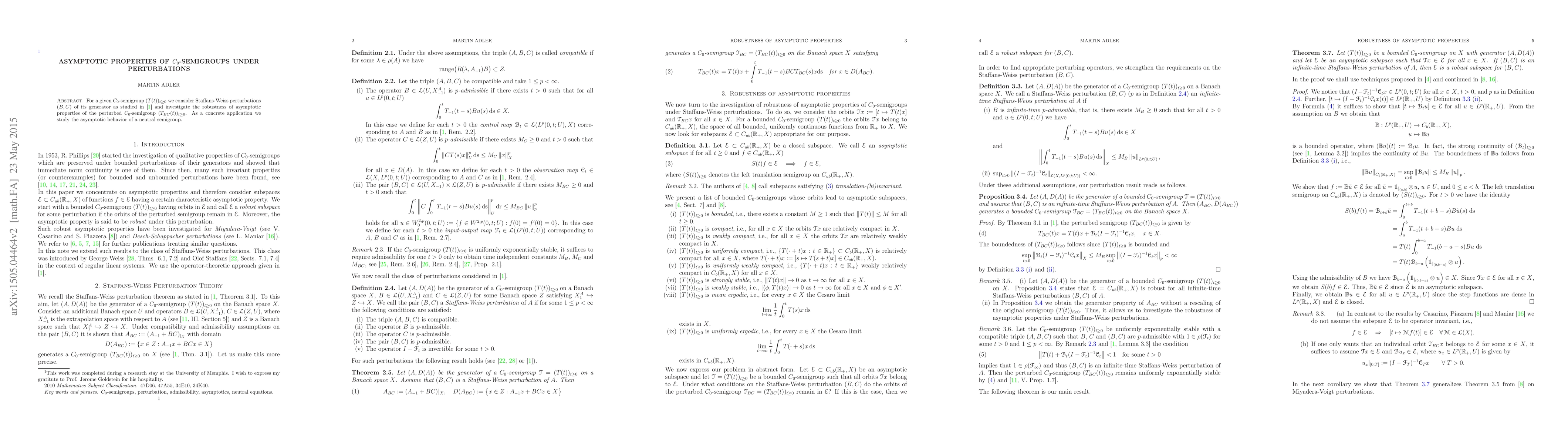 For a given $C_0$-semigroup $(T(t))_{t\geq 0}$ we consider Staffans-Weiss perturbations $(B,C)$ of its generator as studied in [1] and investigate the robustness of asymptotic properties of the perturbed $C_0$-semigroup $(T_{BC}(t))_{t\geq 0}$. As a concrete application we study the asymptotic behavior of a neutral semigroup.