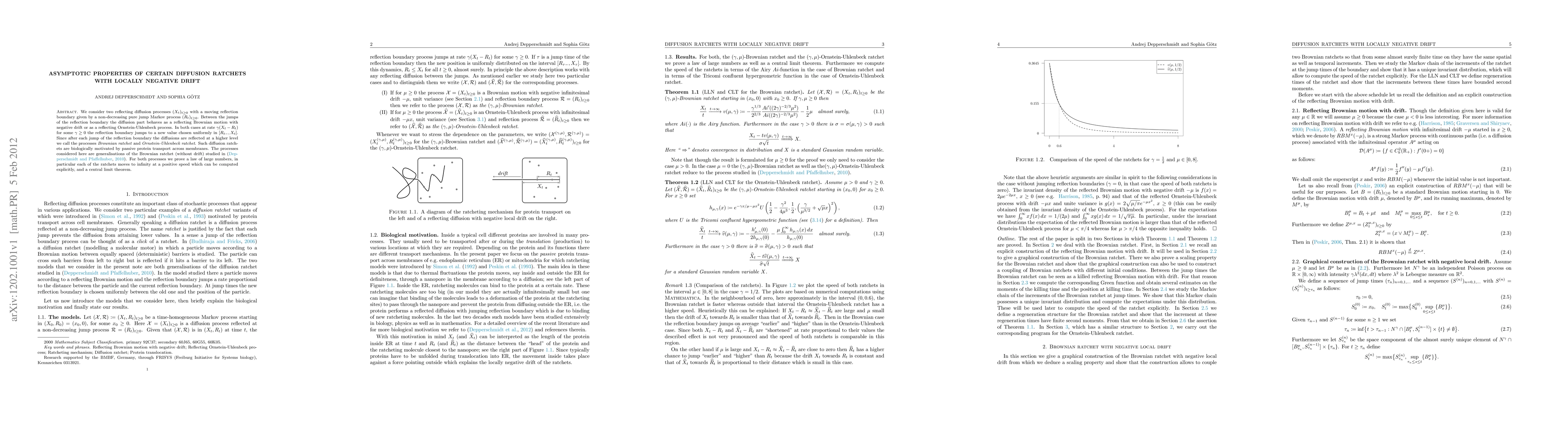 We consider two reflecting diffusion processes $(X_t)_{t \ge 0}$ with a moving reflection boundary given by a non-decreasing pure jump Markov process $(R_t)_{t \ge 0}$. Between the jumps of the reflection boundary the diffusion part behaves as a reflecting Brownian motion with negative drift or as a reflecting Ornstein-Uhlenbeck process. In both cases at rate $\gamma(X_t -R_t)$ for some $\gamma \ge 0$ the reflection boundary jumps to a new value chosen uniformly in $[R_{t-},X_t]$. Since after each jump of the reflection boundary the diffusions are reflected at a higher level we call the processes Brownian ratchet and Ornstein-Uhlenbeck ratchet. Such diffusion ratchets are biologically motivated by passive protein transport across membranes. The processes considered here are generalisations of the Brownian ratchet (without drift) studied in (Depperschmidt and Pfaffelhuber, 2010). For both processes we prove a law of large numbers, in particular each of the ratchets moves to infinity at a positive speed which can be computed explicitly, and a central limit theorem.