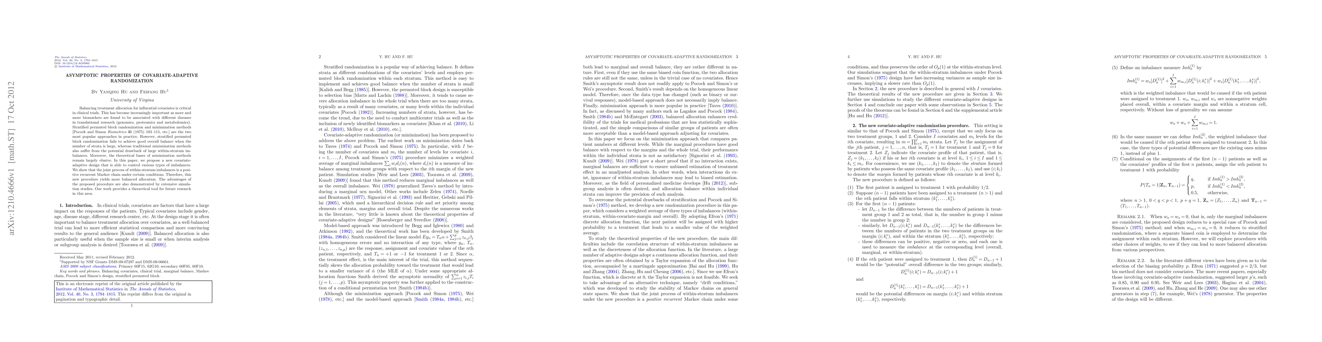 Balancing treatment allocation for influential covariates is critical in clinical trials. This has become increasingly important as more and more biomarkers are found to be associated with different diseases in translational research (genomics, proteomics and metabolomics). Stratified permuted block randomization and minimization methods [Pocock and Simon Biometrics 31 (1975) 103-115, etc.] are the two most popular approaches in practice. However, stratified permuted block randomization fails to achieve good overall balance when the number of strata is large, whereas traditional minimization methods also suffer from the potential drawback of large within-stratum imbalances. Moreover, the theoretical bases of minimization methods remain largely elusive. In this paper, we propose a new covariate-adaptive design that is able to control various types of imbalances. We show that the joint process of within-stratum imbalances is a positive recurrent Markov chain under certain conditions. Therefore, this new procedure yields more balanced allocation. The advantages of the proposed procedure are also demonstrated by extensive simulation studies. Our work provides a theoretical tool for future research in this area.