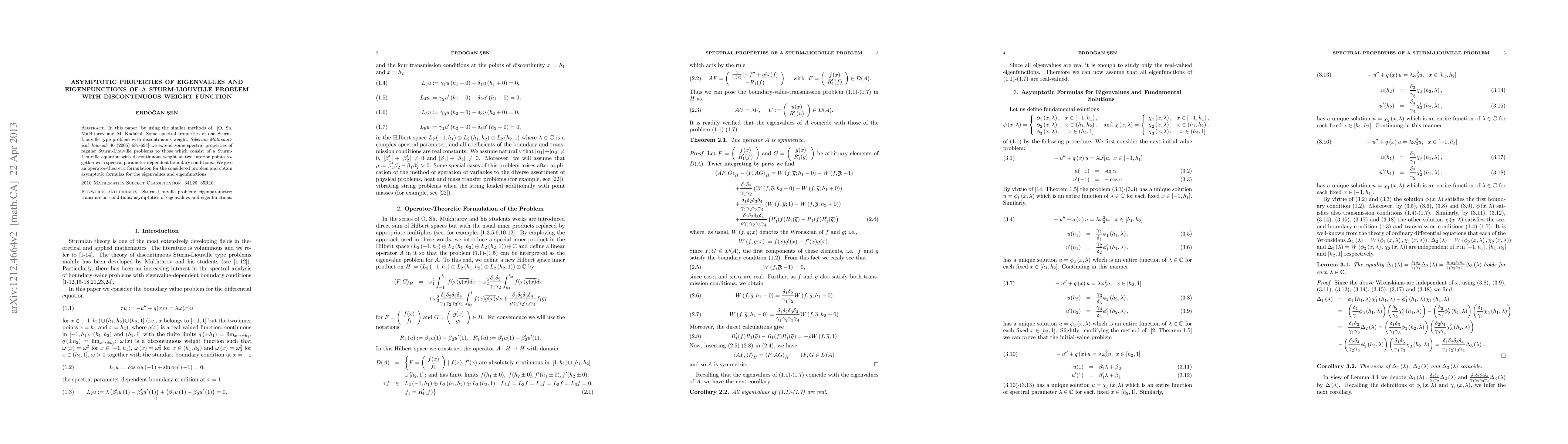This paper extends spectral properties of regular Sturm-Liouville problems to those with a discontinuous weight function at two interior points, using operator-theoretic methods. It provides asymptotic formulas for the eigenvalues and eigenfunctions of the problem.