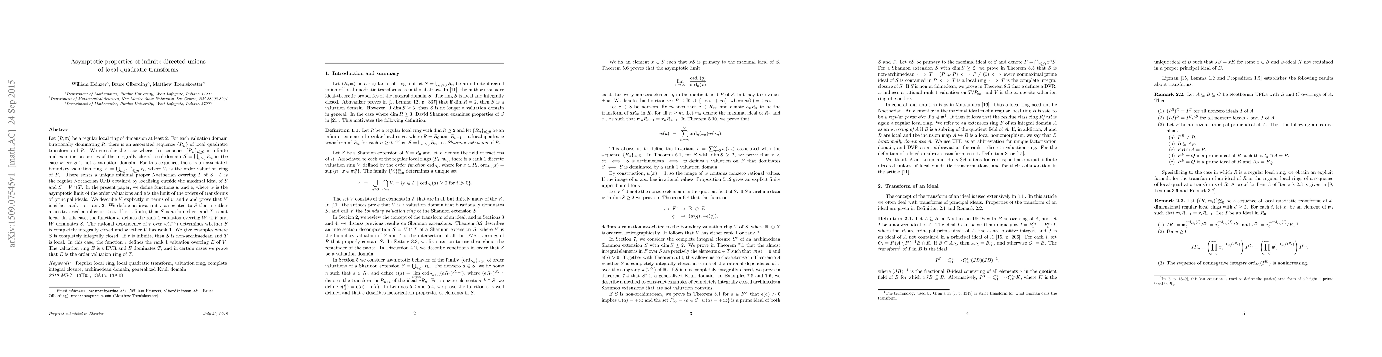 We consider infinite sequences {R_n} of successive local quadratic transforms of a regular local ring. Let S denote the directed union of the sequence of regular local rings R_n. We previously showed the existence of a unique limit point V of the family of order valuation rings of the sequence. In this paper, we examine asymptotic properties of this family of order valuations. We link this asymptotic behavior to ring-theoretic properties of S, namely whether S is archimedean and whether S is completely integrally closed. We construct examples of such S that are archimedean and completely integrally closed but not valuation domains. We give an explicit description of V, where the description depends on whether S is archimedean or non-archimedean.
