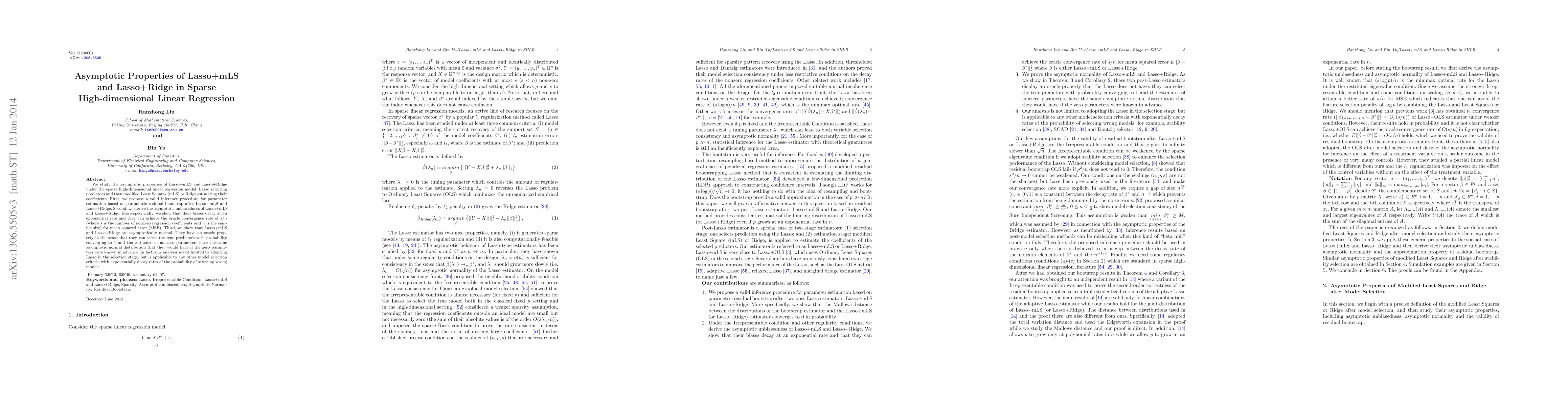 This paper investigates the asymptotic properties of Lasso+mLS and Lasso+Ridge in sparse high-dimensional linear regression, demonstrating their unbiasedness, exponential decay of bias, and oracle convergence rate for mean squared error. It also proves their asymptotic normality and oracle property for predictor selection.