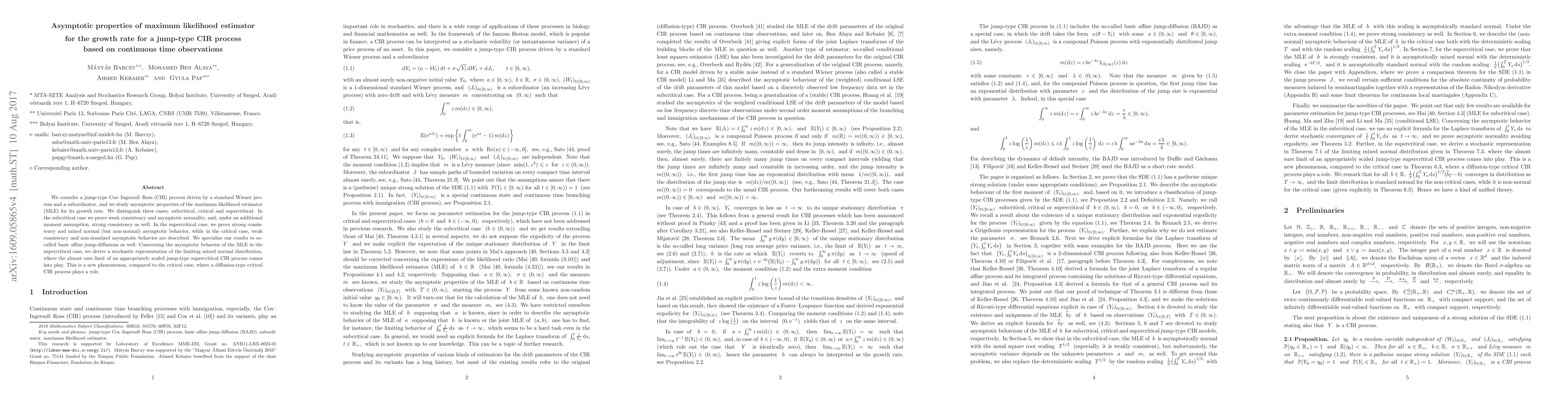 We consider a jump-type Cox--Ingersoll--Ross (CIR) process driven by a standard Wiener process and a subordinator, and we study asymptotic properties of the maximum likelihood estimator (MLE) for its growth rate. We distinguish three cases: subcritical, critical and supercritical. In the subcritical case we prove weak consistency and asymptotic normality, and, under an additional moment assumption, strong consistency as well. In the supercritical case, we prove strong consistency and mixed normal (but non-normal) asymptotic behavior, while in the critical case, weak consistency and non-standard asymptotic behavior are described. We specialize our results to so-called basic affine jump-diffusions as well. Concerning the asymptotic behavior of the MLE in the supercritical case, we derive a stochastic representation of the limiting mixed normal distribution, where the almost sure limit of an appropriately scaled jump-type supercritical CIR process comes into play. This is a new phenomenon, compared to the critical case, where a diffusion-type critical CIR process plays a role.